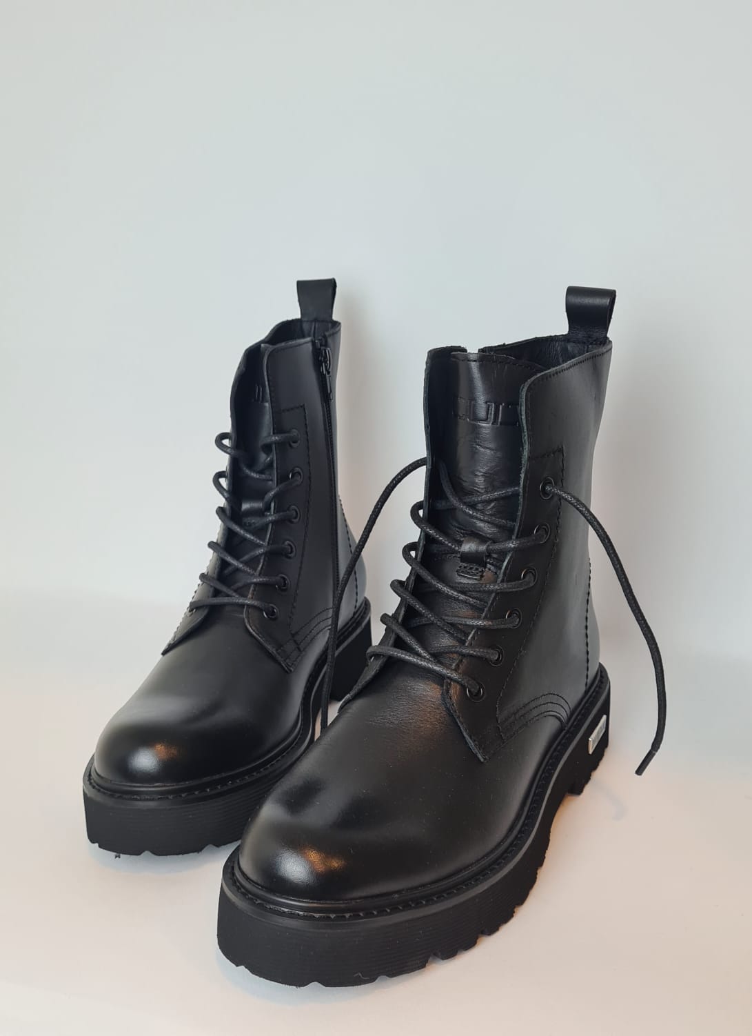Anfibio in vera pelle, occhielli tono su tono, targhetta con logo sulla suola di gomma e linguetta posteriore.