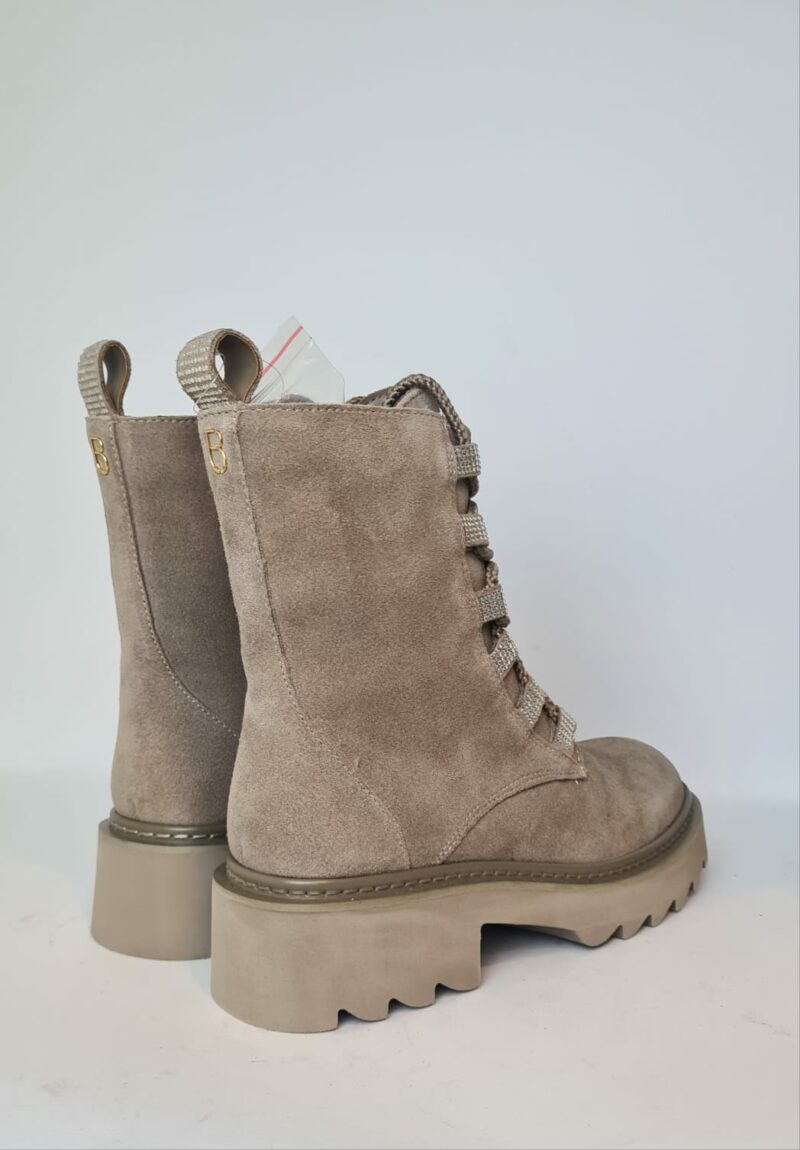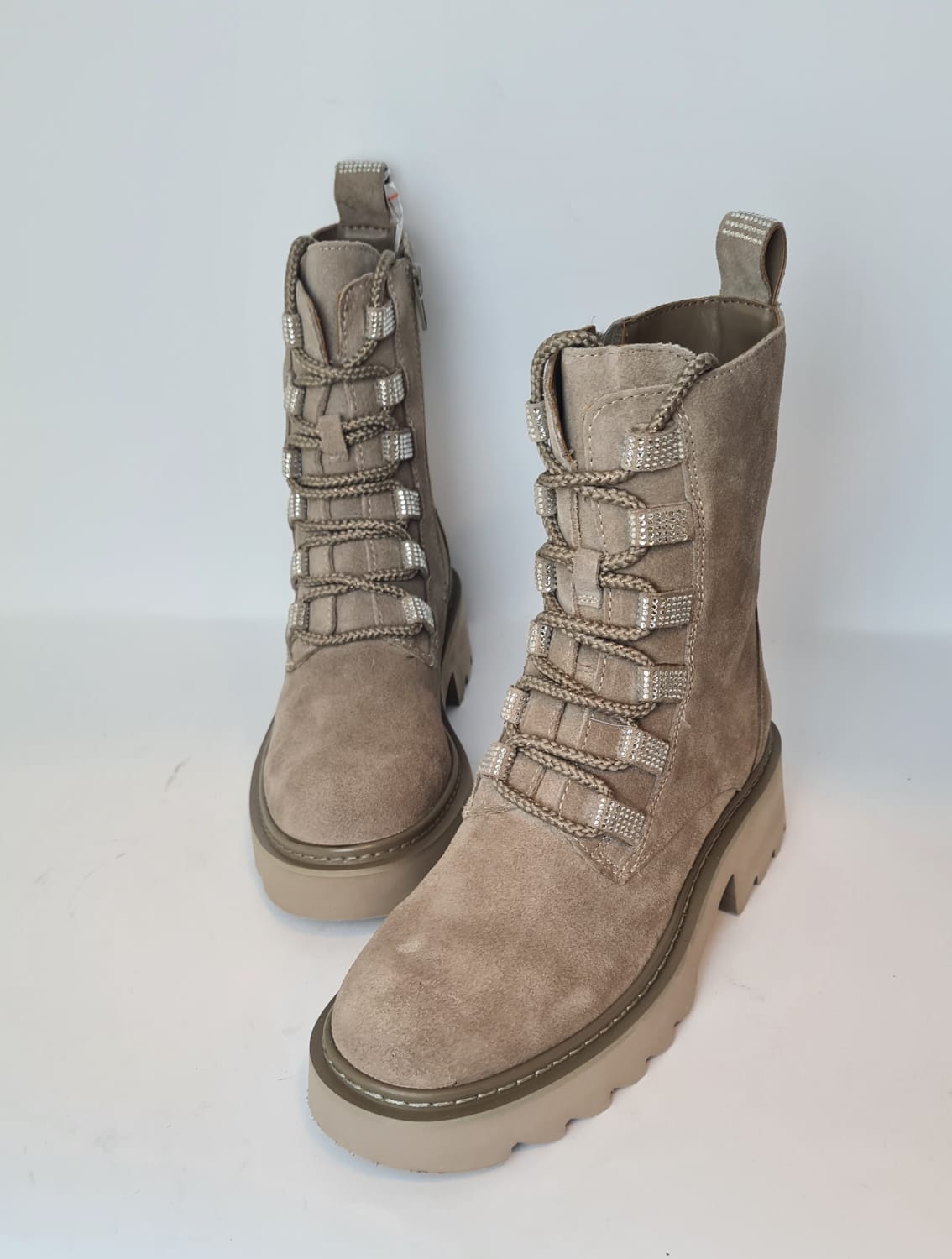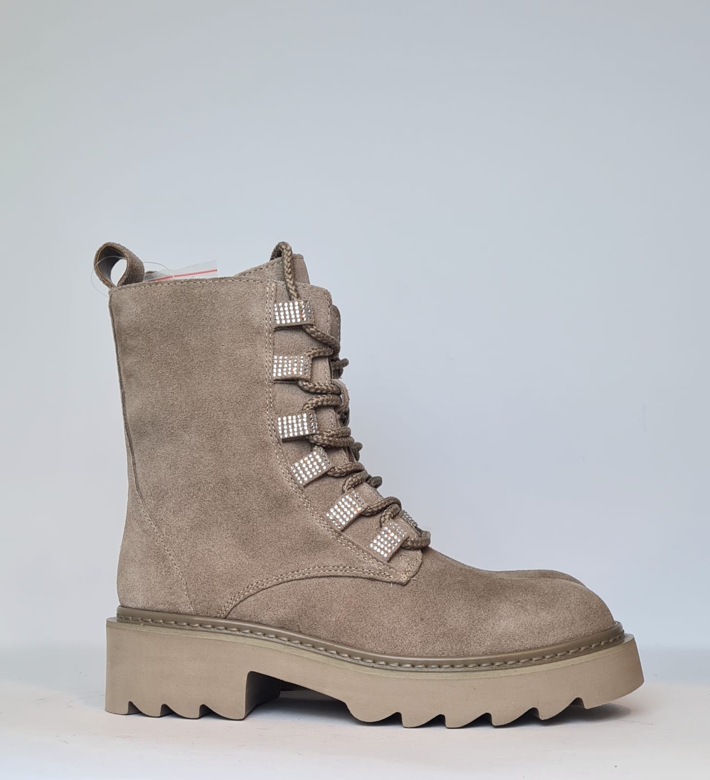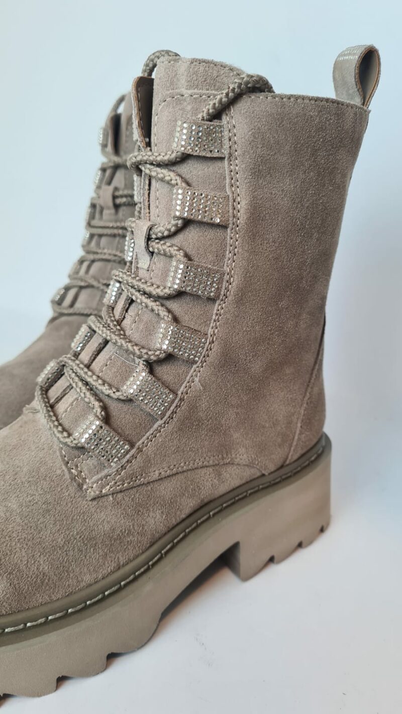 Anfibio scamosciato con strass ai lati dei lacci e zip sul lato interno per facilitare la calzata.