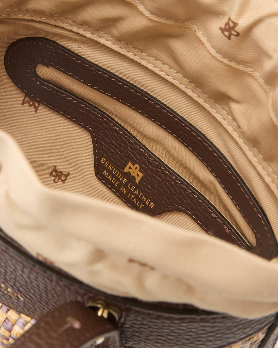 Secchiello in pelle e rafia, bicolore. Pratico e capiente, con tracolla regolabile e rimovibile.