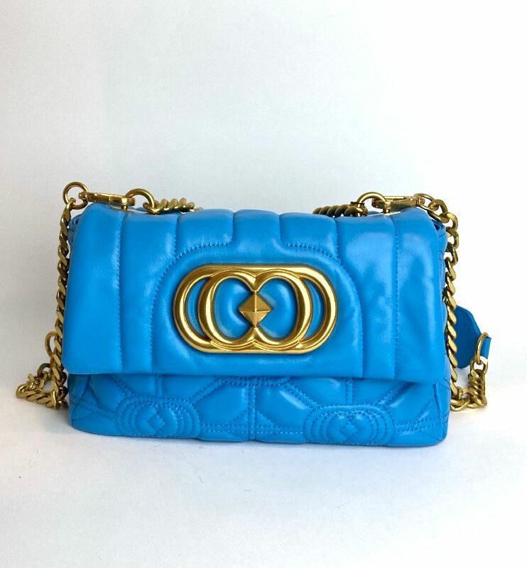 Borsa in ecopelle, logo frontale, spuntoni oro, tracolla e manico rigido con finiture oro.