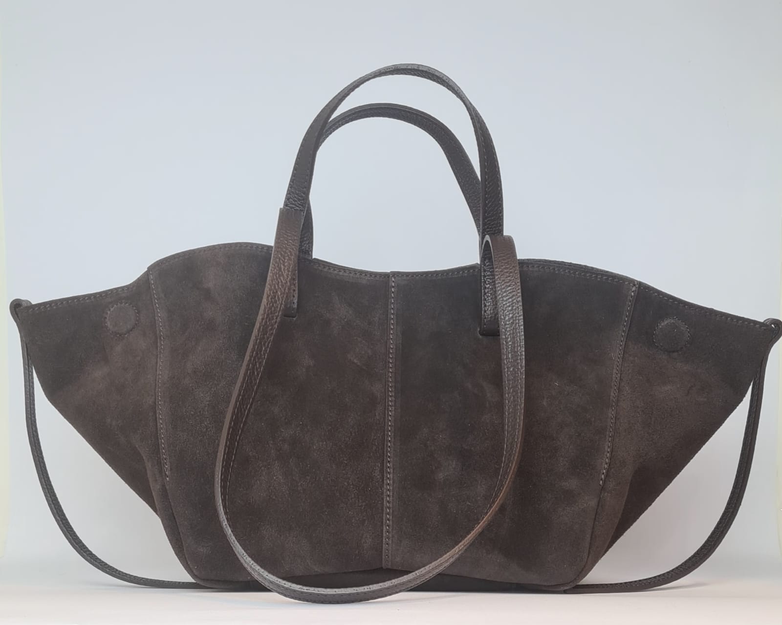 Borsa “Igloo” in pelle scamosciata, a mano e a spalla. Base realizzata con pieghe triangolari su entrambi i lati. Chiusura magnetica e clutch interna. Capiente e comoda.
