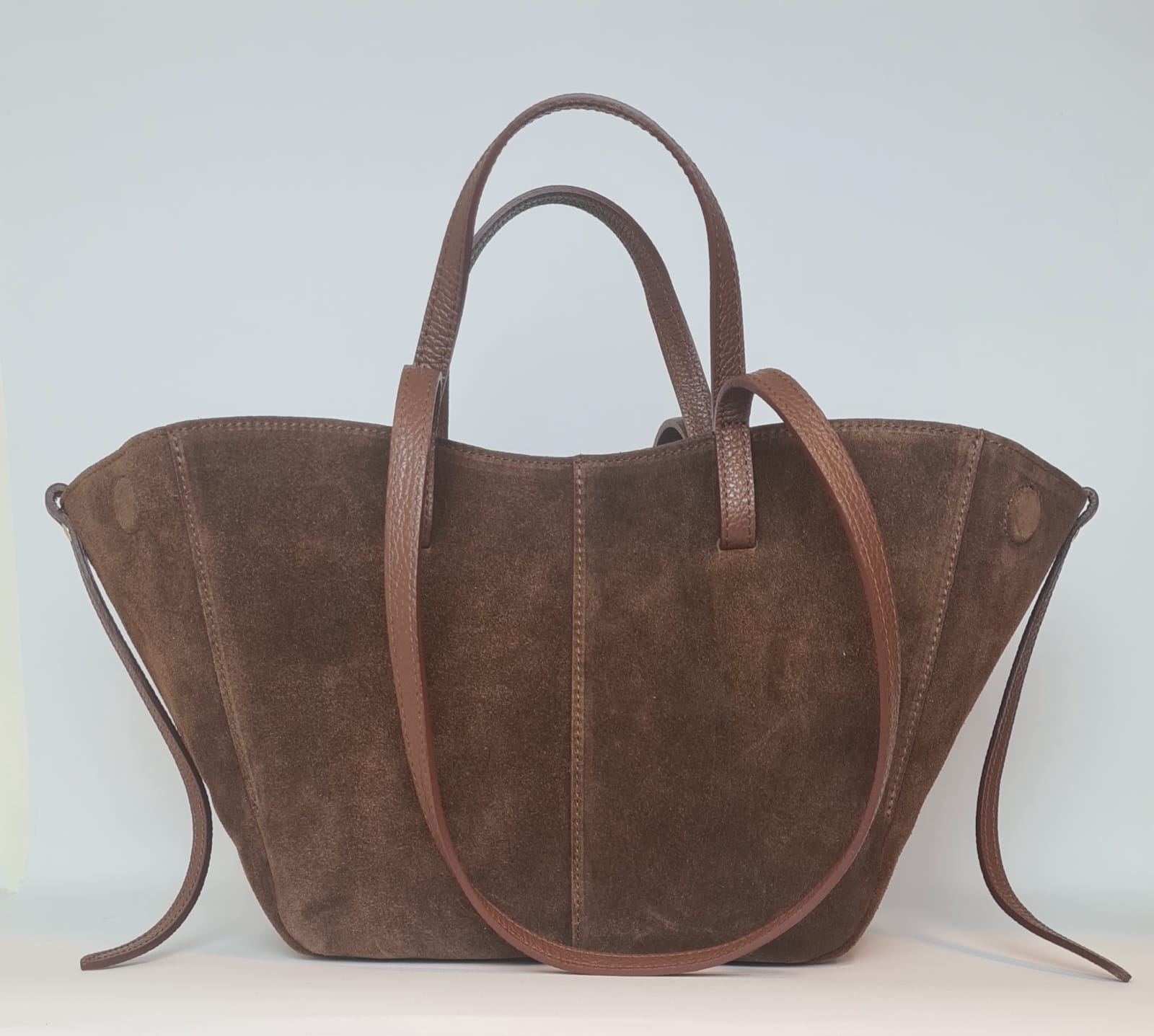 Borsa “Igloo” in pelle scamosciata, a mano e a spalla. Base realizzata con pieghe triangolari su entrambi i lati. Chiusura magnetica e clutch interna. Capiente e comoda.