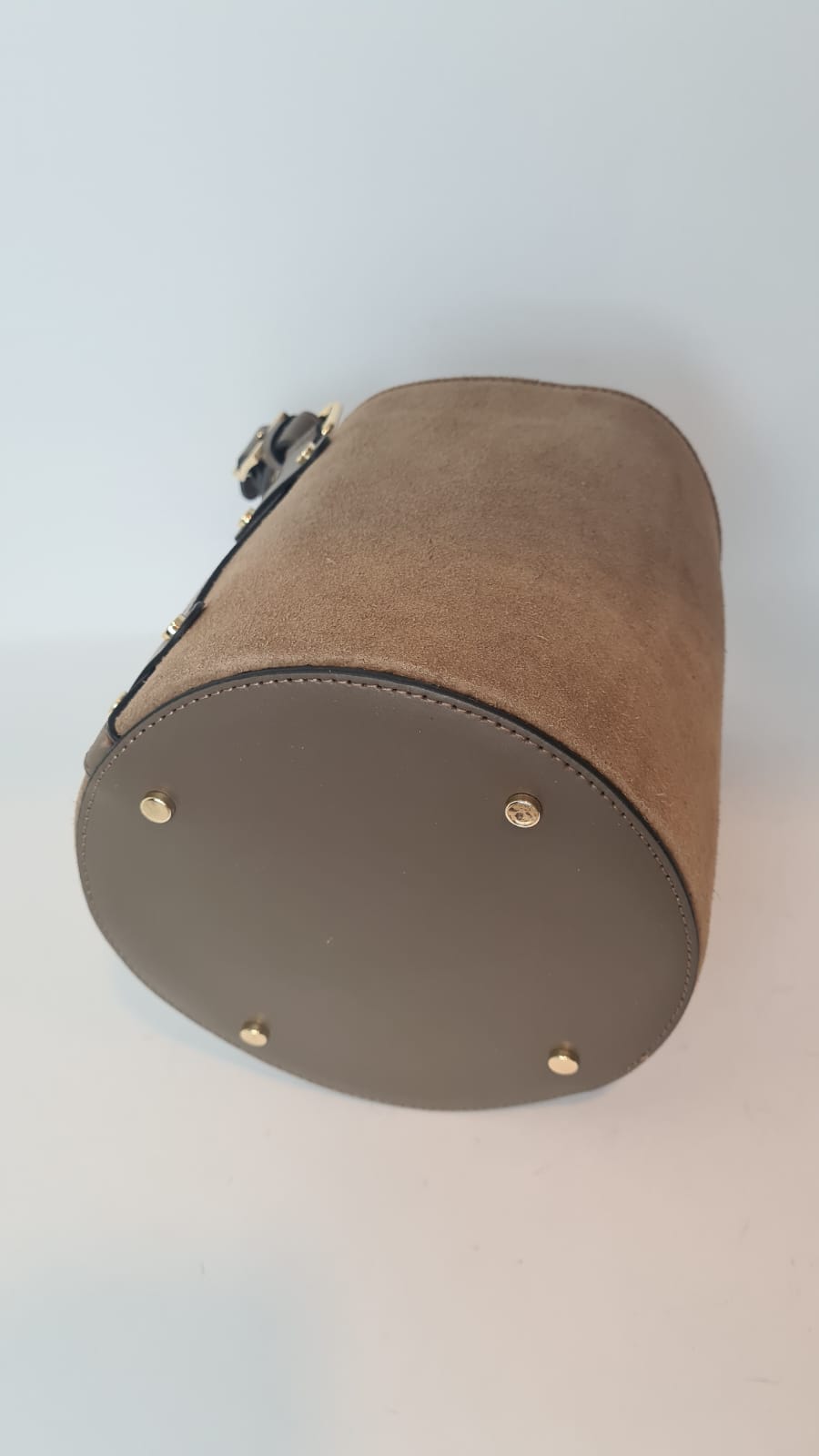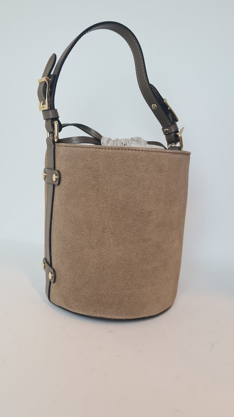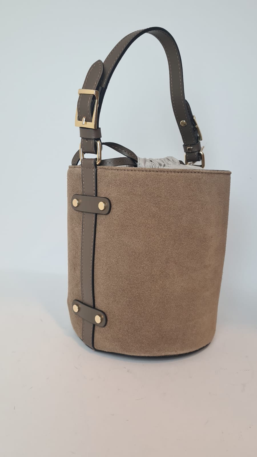 Secchiello “Igloo” in pelle scamosciata, fondo rigido e tracolla rimovibile.