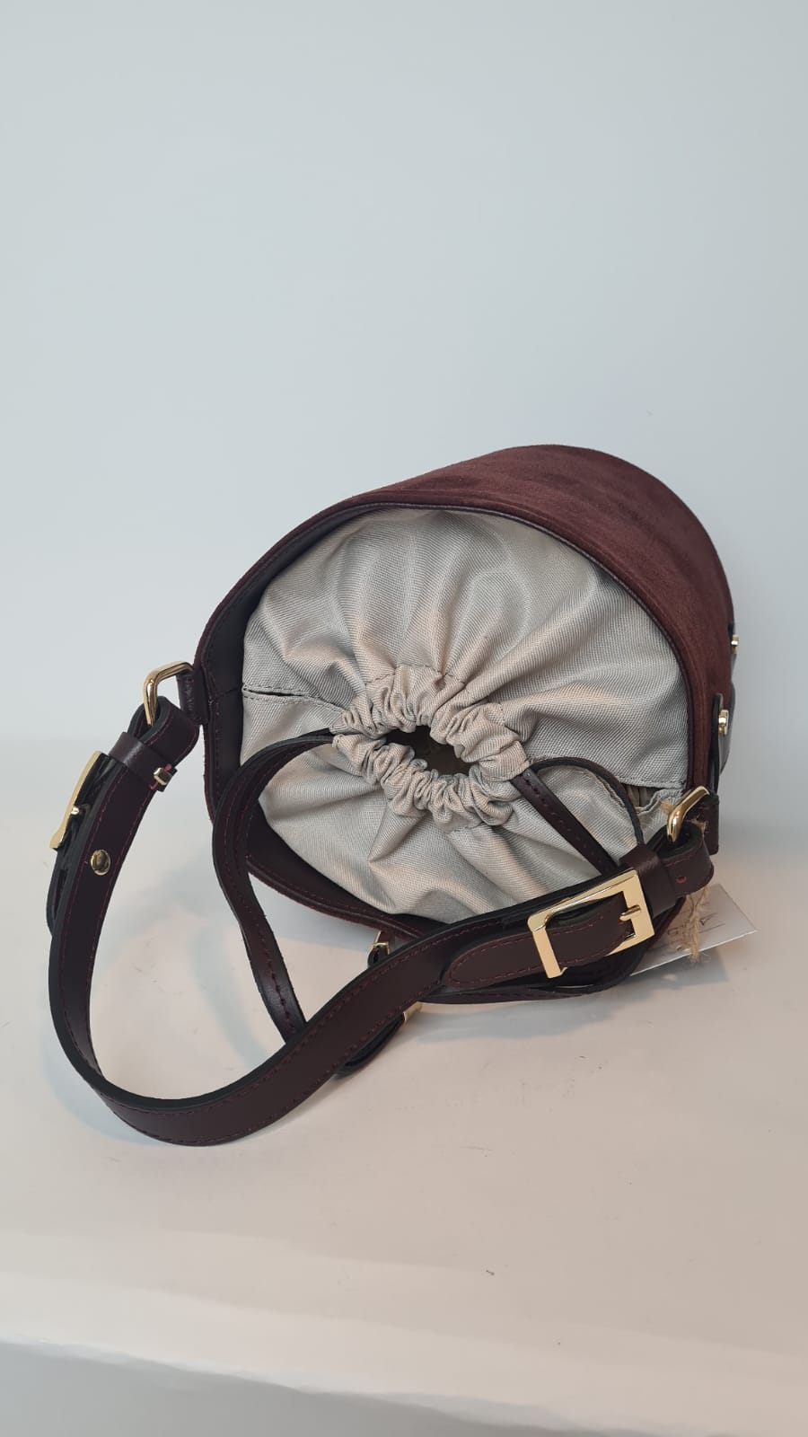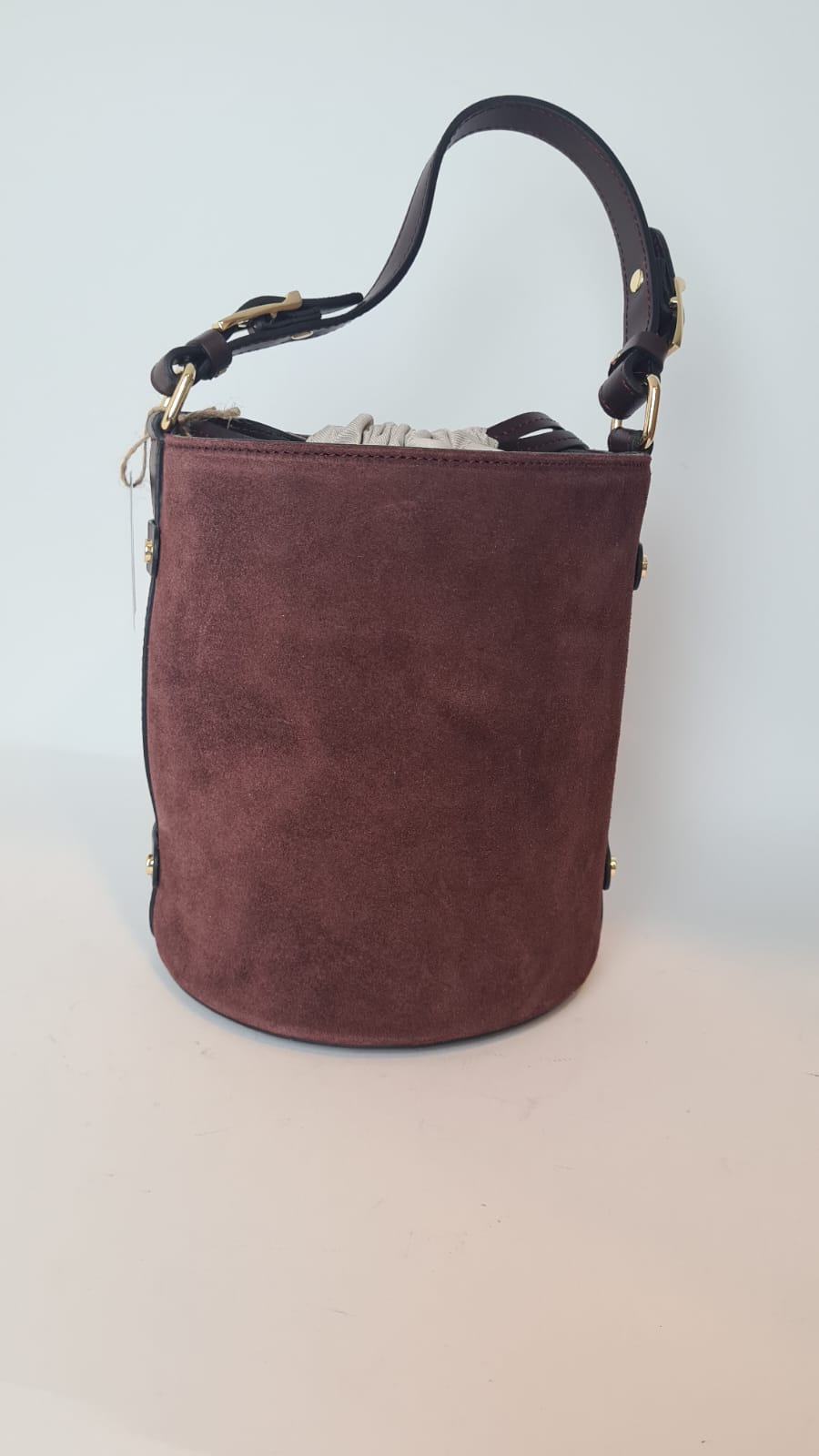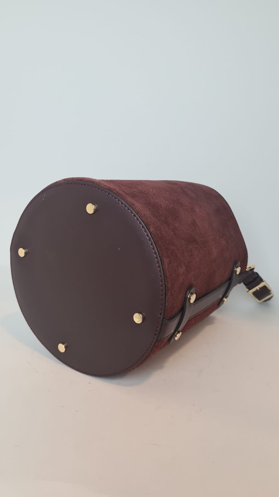 Secchiello “Igloo” in pelle scamosciata, fondo rigido e tracolla rimovibile.