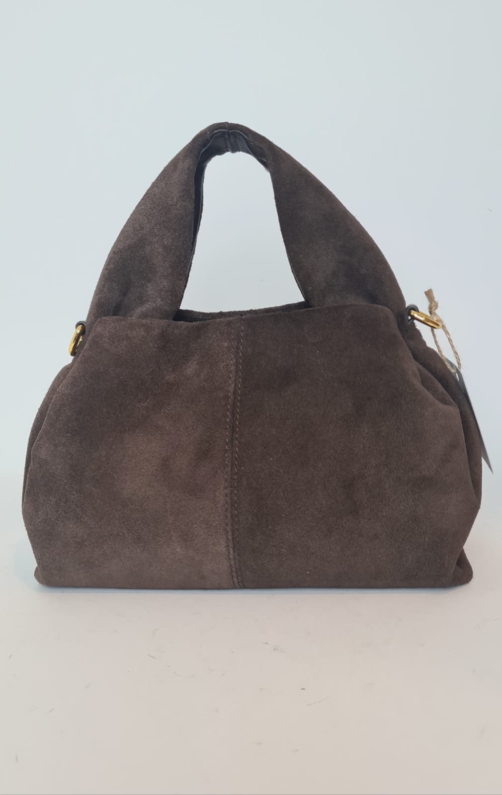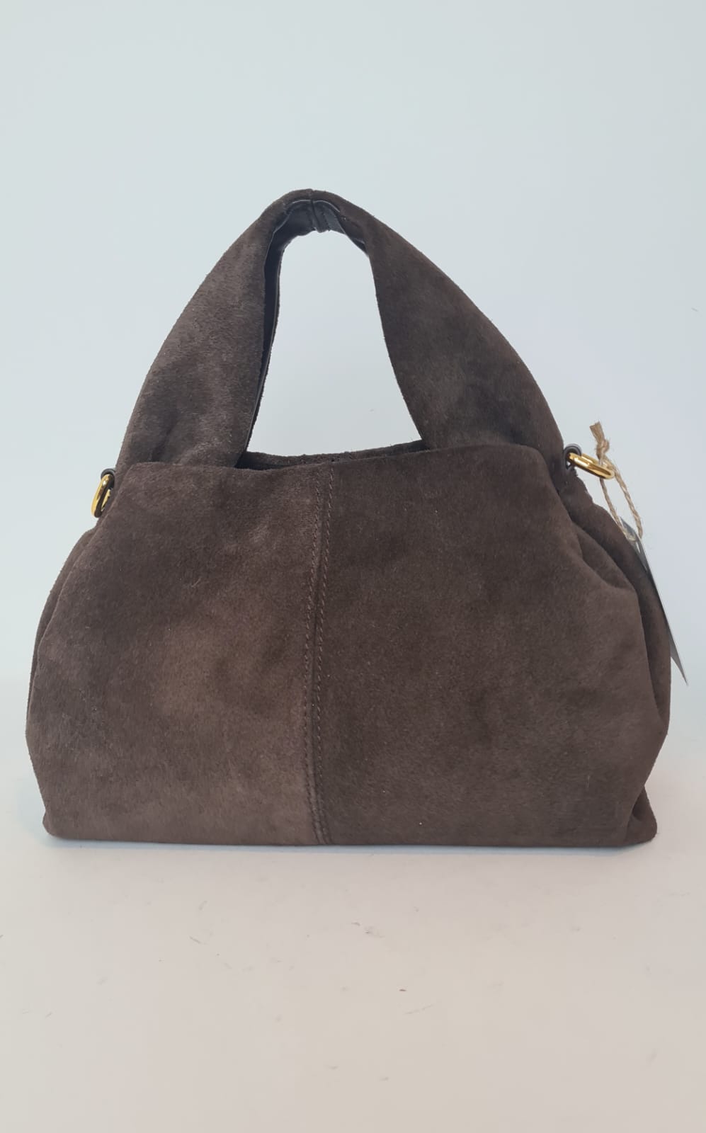Borsa “Igloo” in pelle scamosciata, a mano e con tracolla rimovibile.