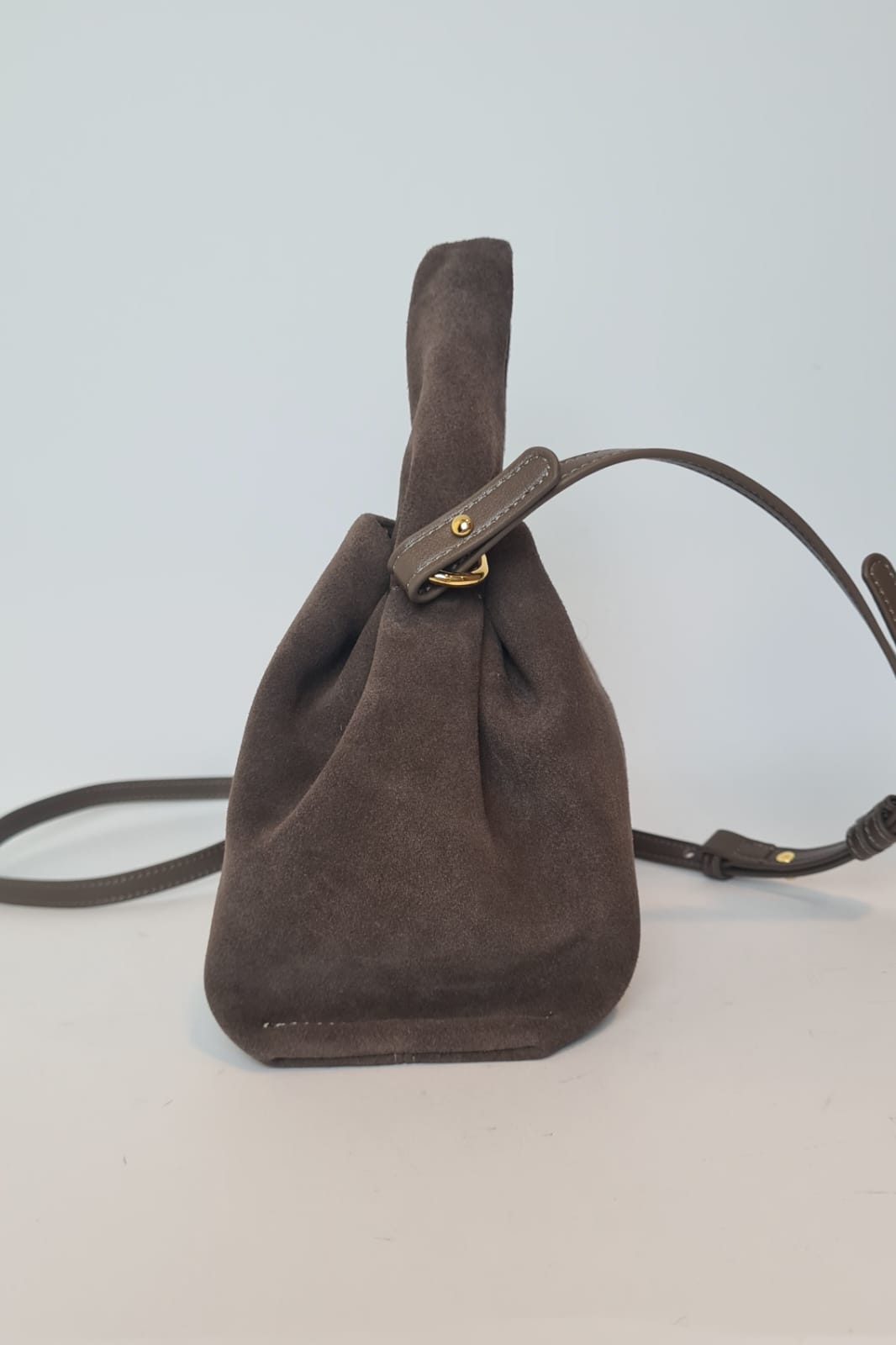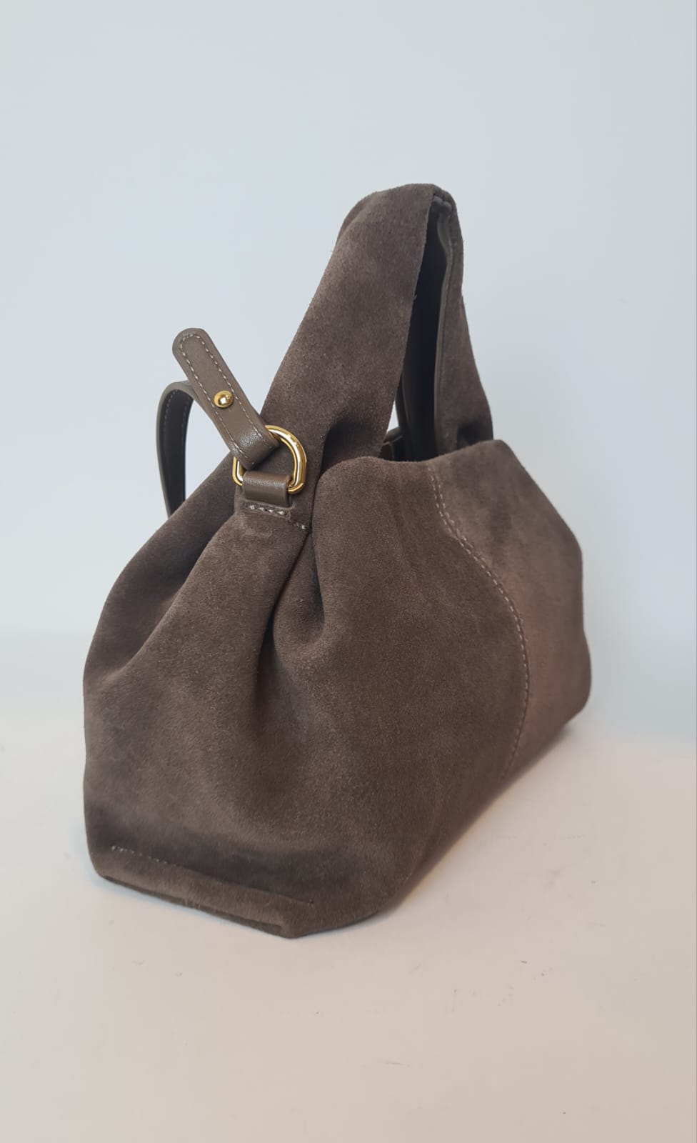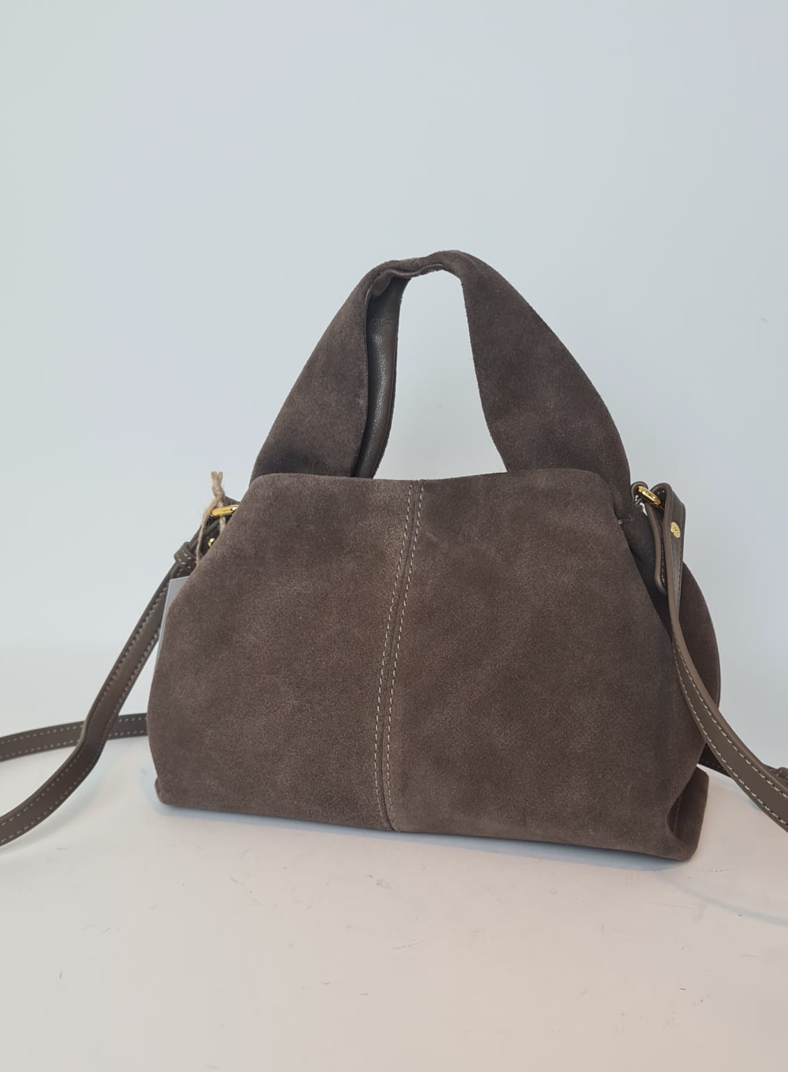 Borsa “Igloo” in pelle scamosciata, a mano e con tracolla rimovibile.