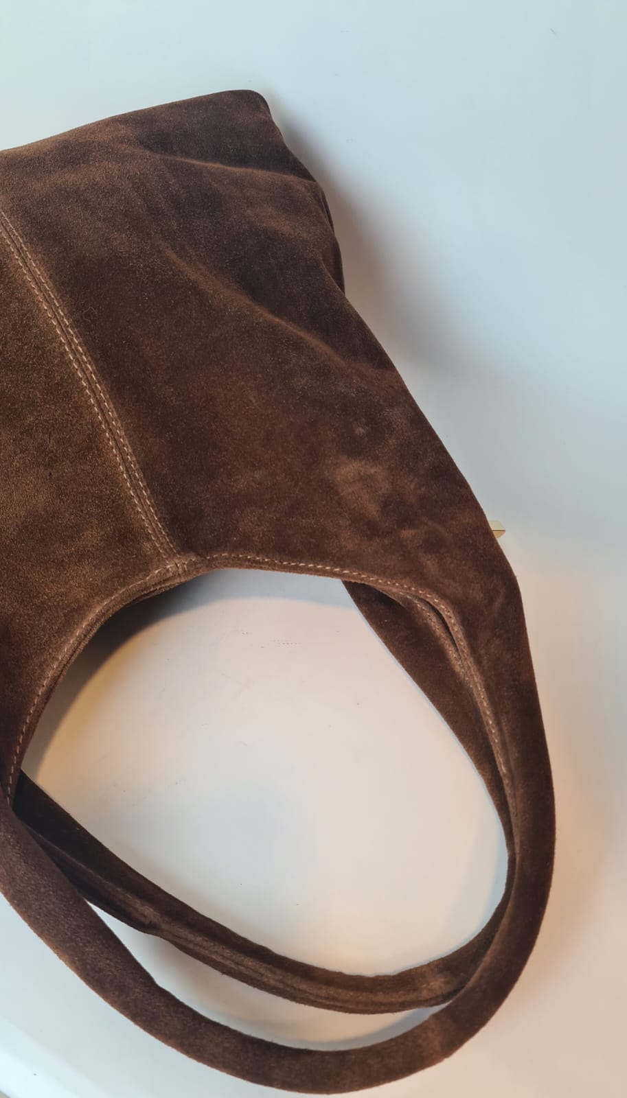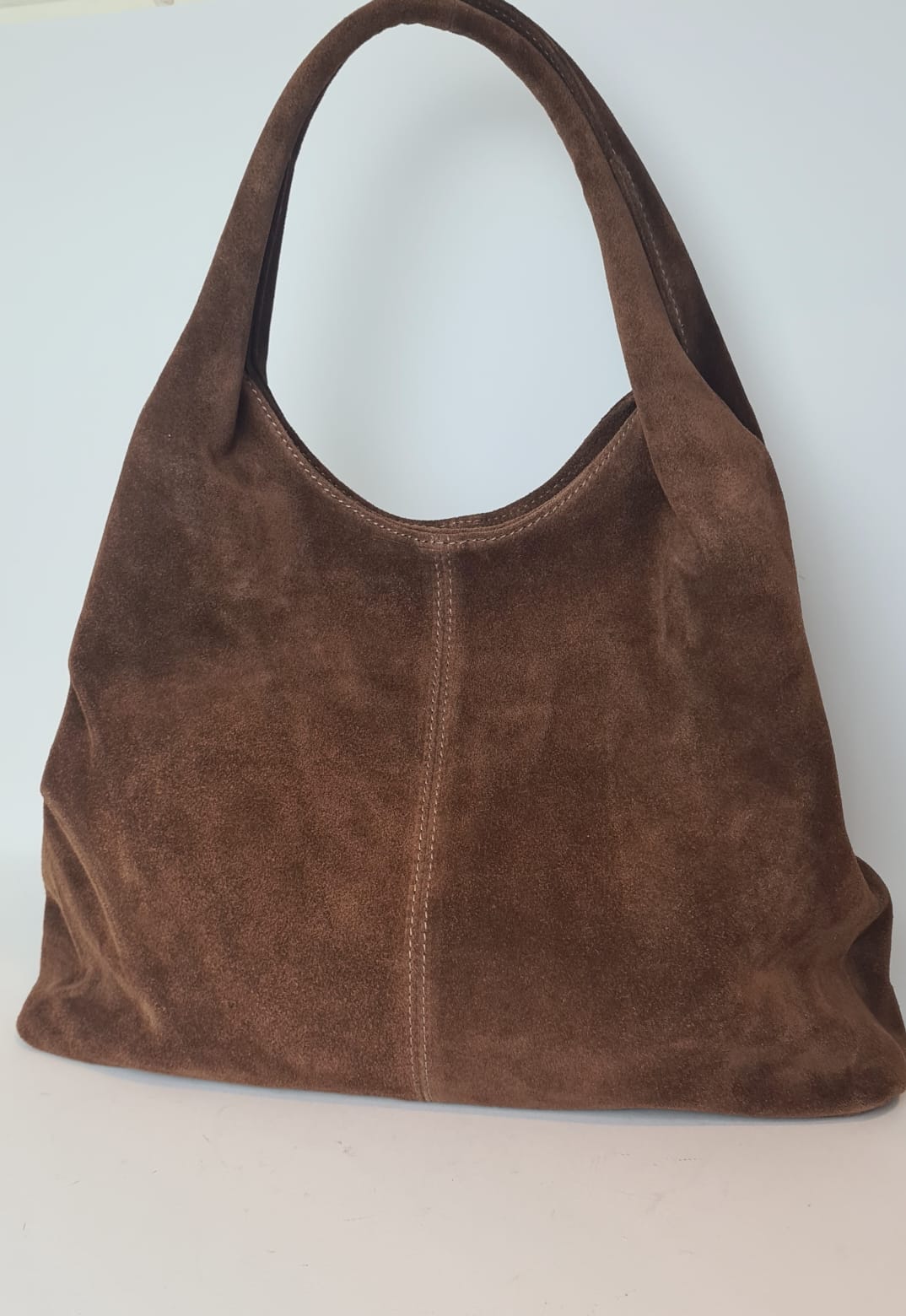 Borsa “Igloo” in pelle scamosciata, a mano e a spalla, morbida e capiente.