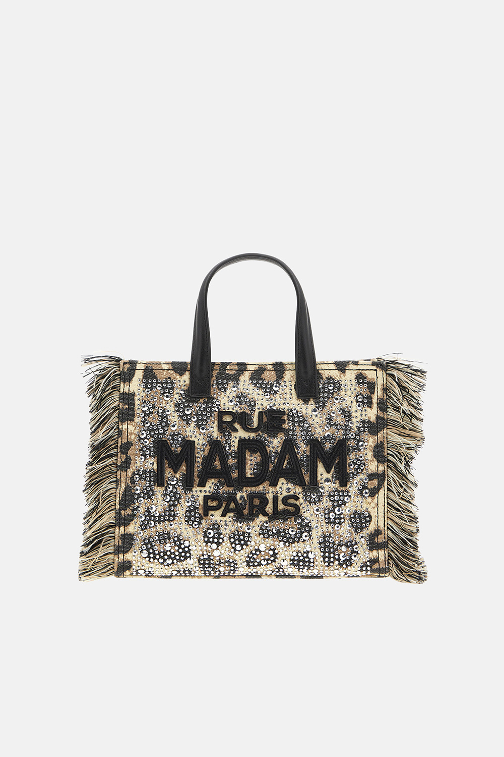 Mini Tote bag “Rue Madam Paris” in canvas dal carattere deciso e ricercato, impreziosita da frange e applicazioni di strass che aggiungono personalità al design.