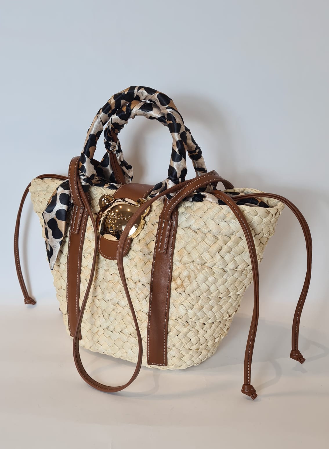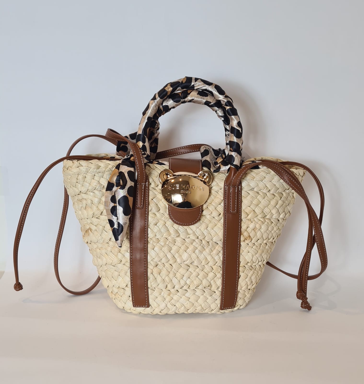 Secchiello in paglia naturale “Rue Madam Paris” con iconica chiusura a orsetto in oro lucido.