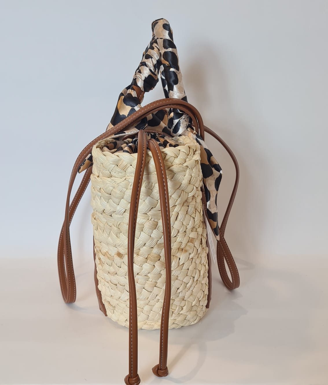 Manici in ecopelle ricoperti in raso fantasia e doppia tracolla con cuciture a contrasto.