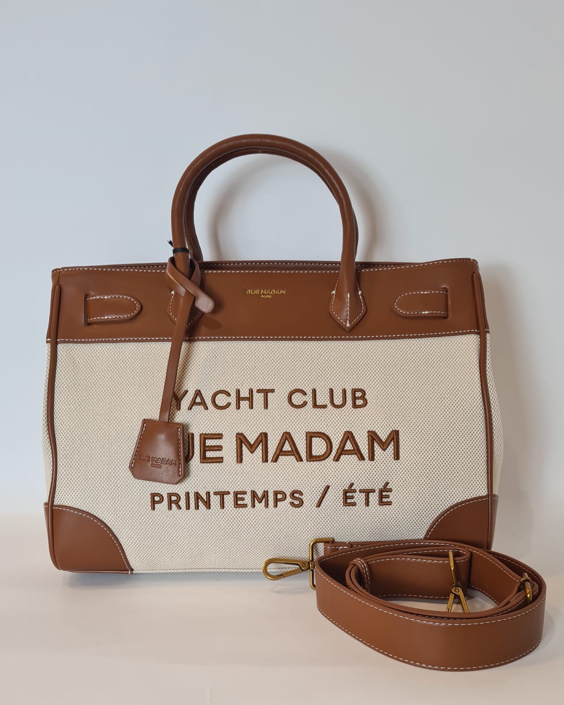 Tote bag in canvas “Rue Madam Paris” dal design elegante e raffinato, valorizzata da profilature e dettagli in ecopelle con cuciture a contrasto.  Modello impreziosito dal nuovo ricamo “YACHT CLUB”.