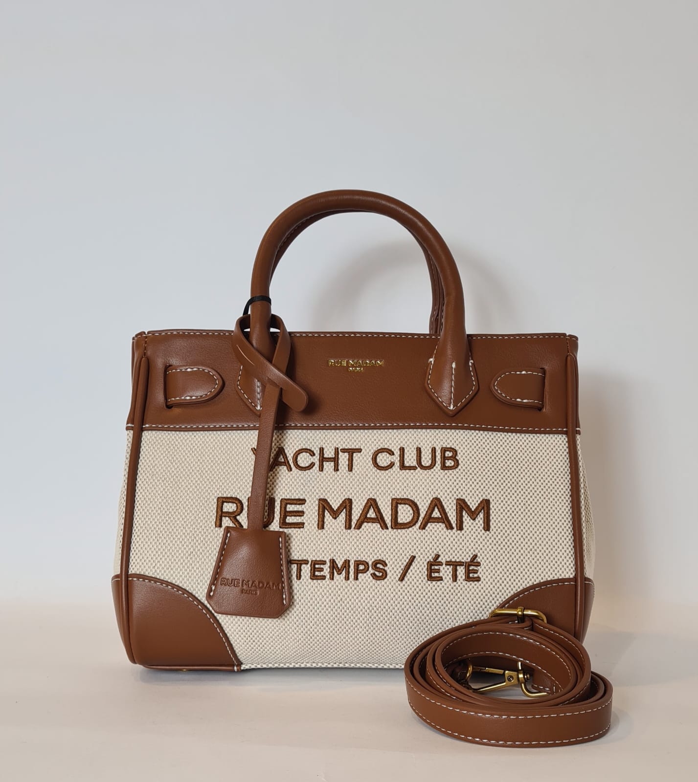 Mini Tote bag in canvas “Rue Madam Paris” dal design elegante e raffinato, valorizzata da profilature e dettagli in ecopelle con cuciture a contrasto. Modello impreziosito dal nuovo ricamo “YACHT CLUB”.