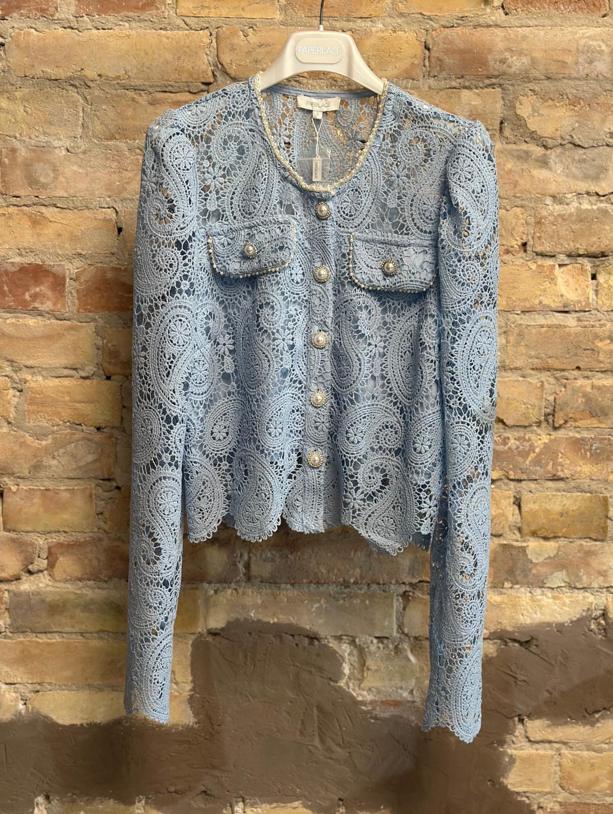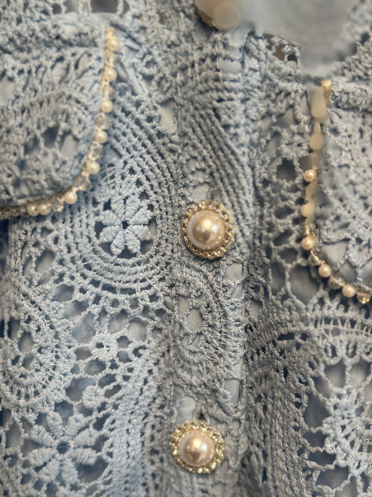 Giacchino in pizzo, collo a giro e chiusura con bottoni gioiello.