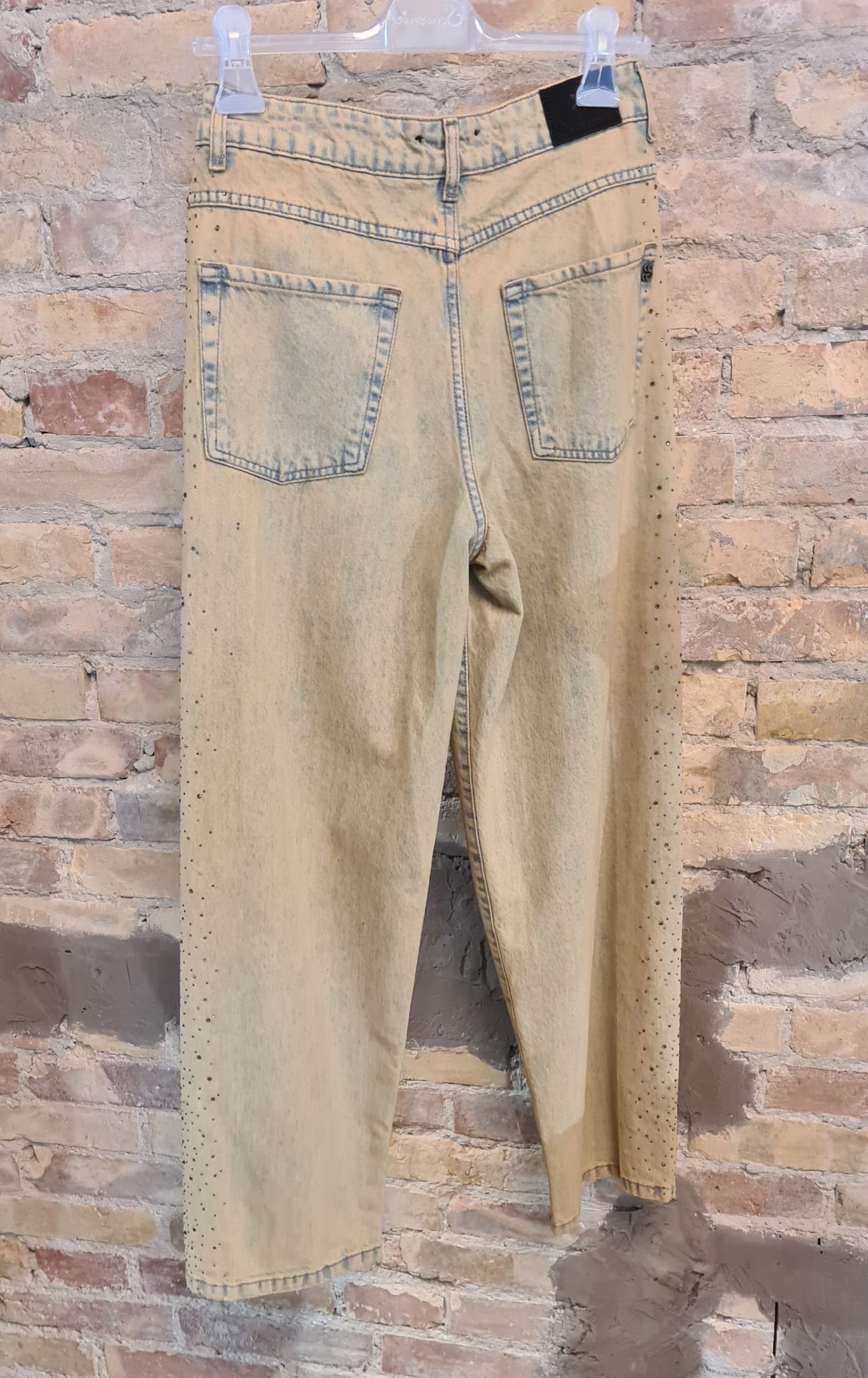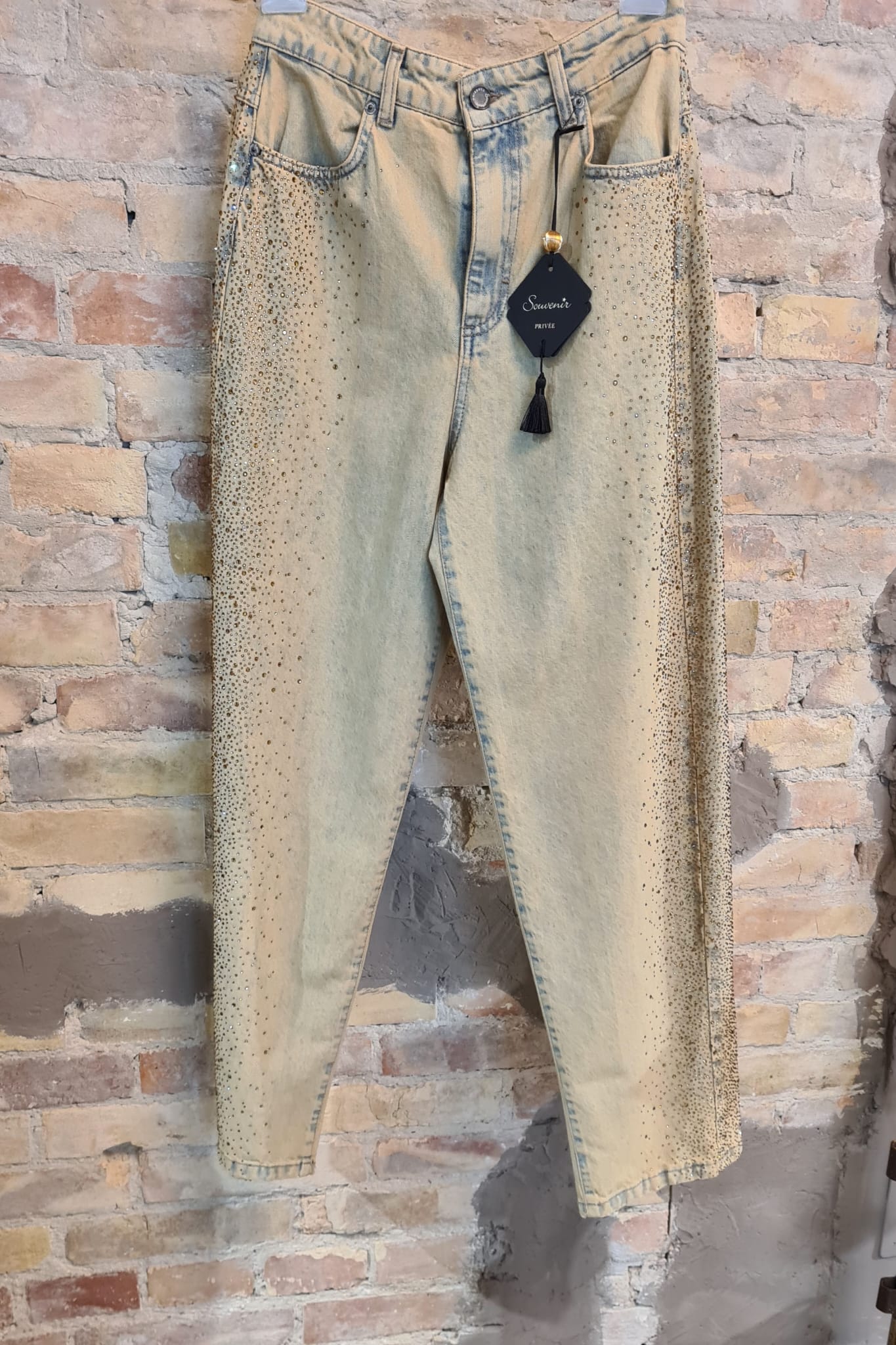 Jeans lavaggio slavato, vestibilità over con applicazione di strass.