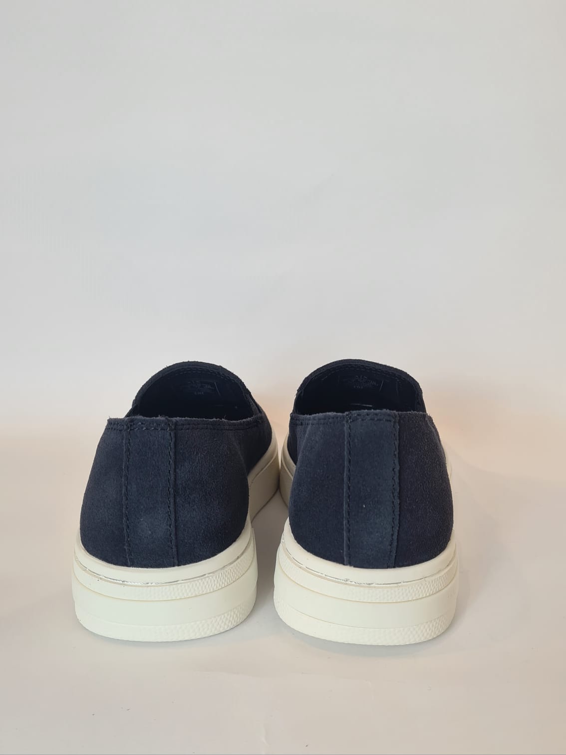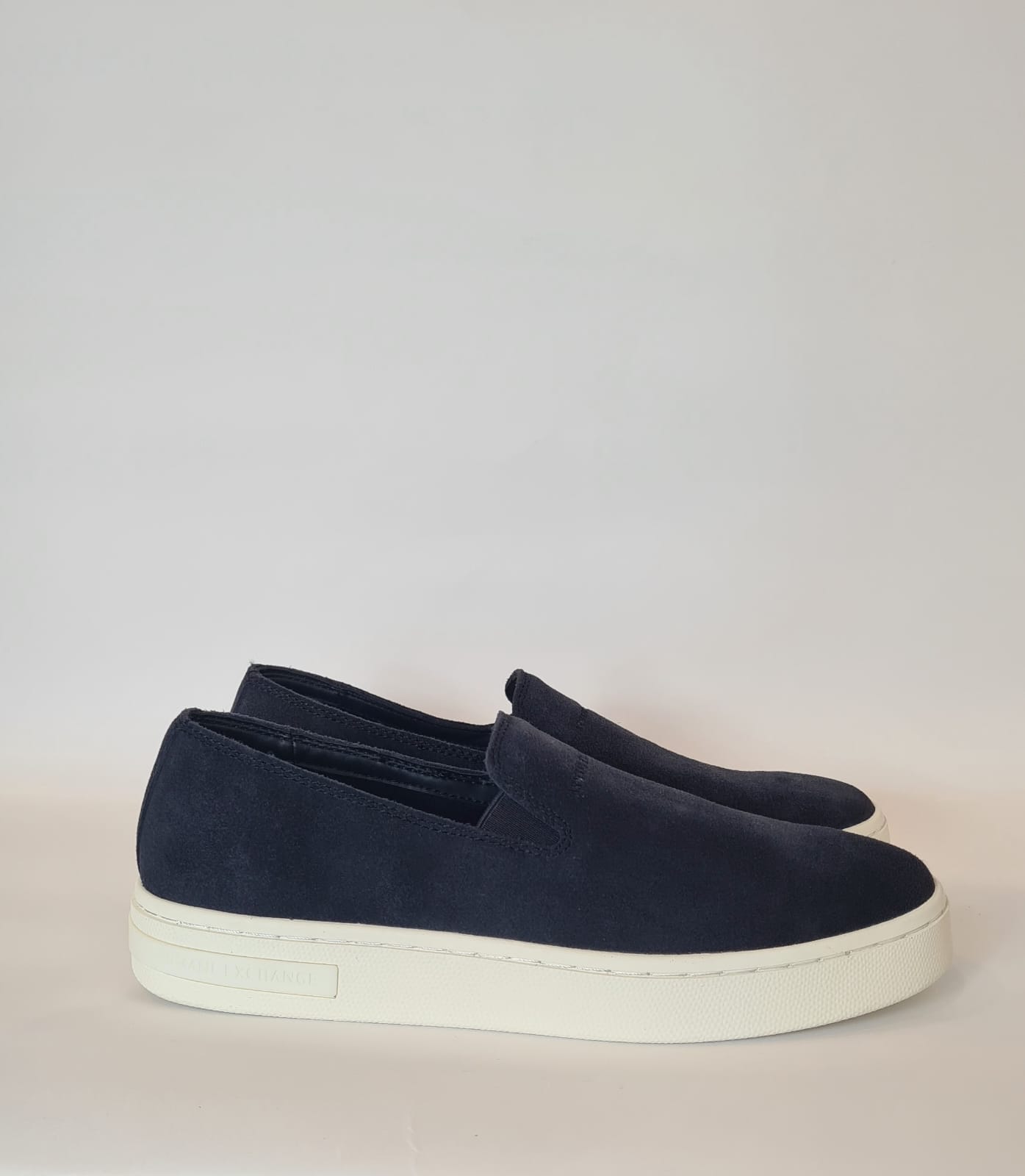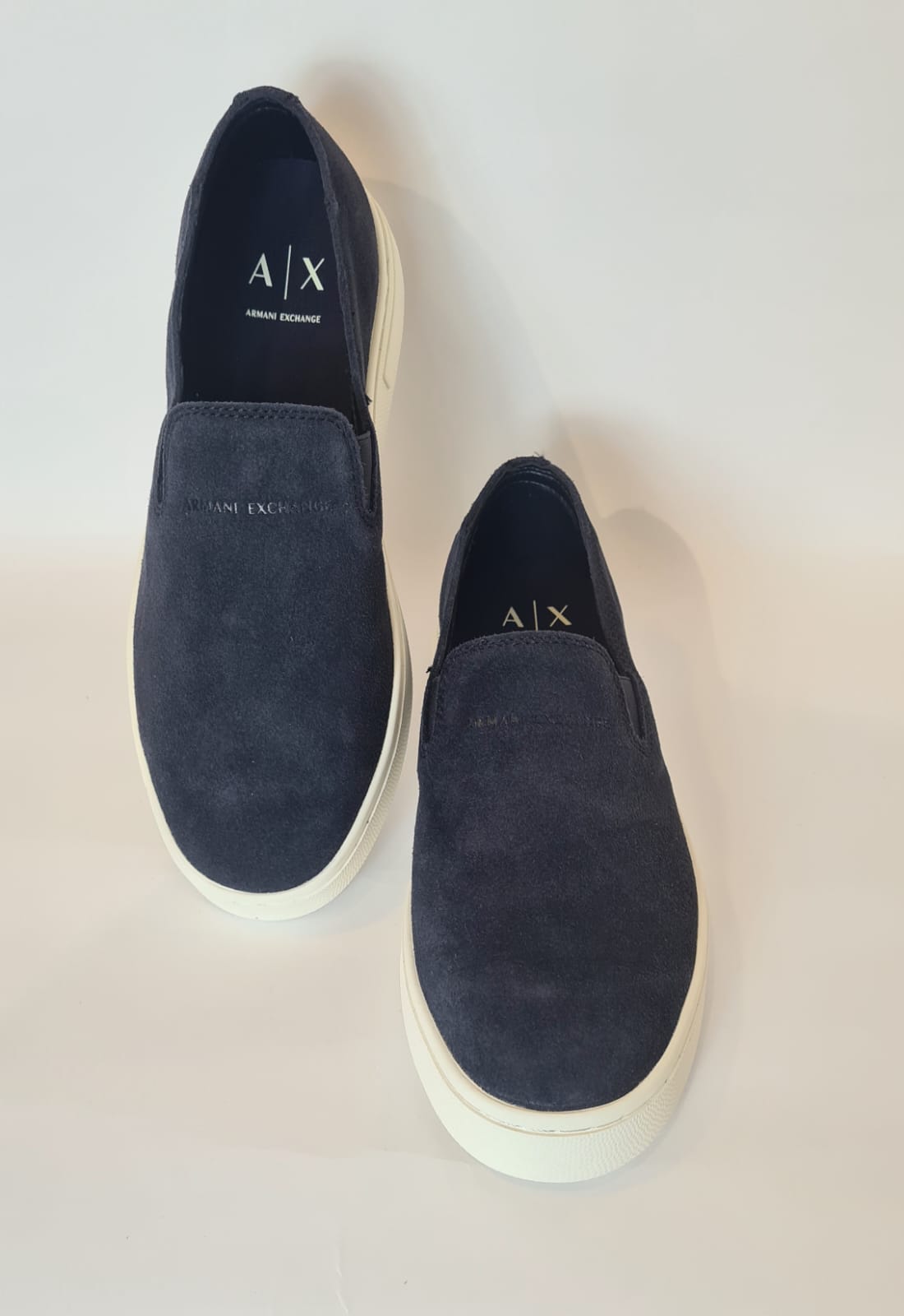 Mocassino “Armani Exchange” in pelle scamosciata, logo sulla tomaia, interno in tessuto. Fondo in gomma bianco.