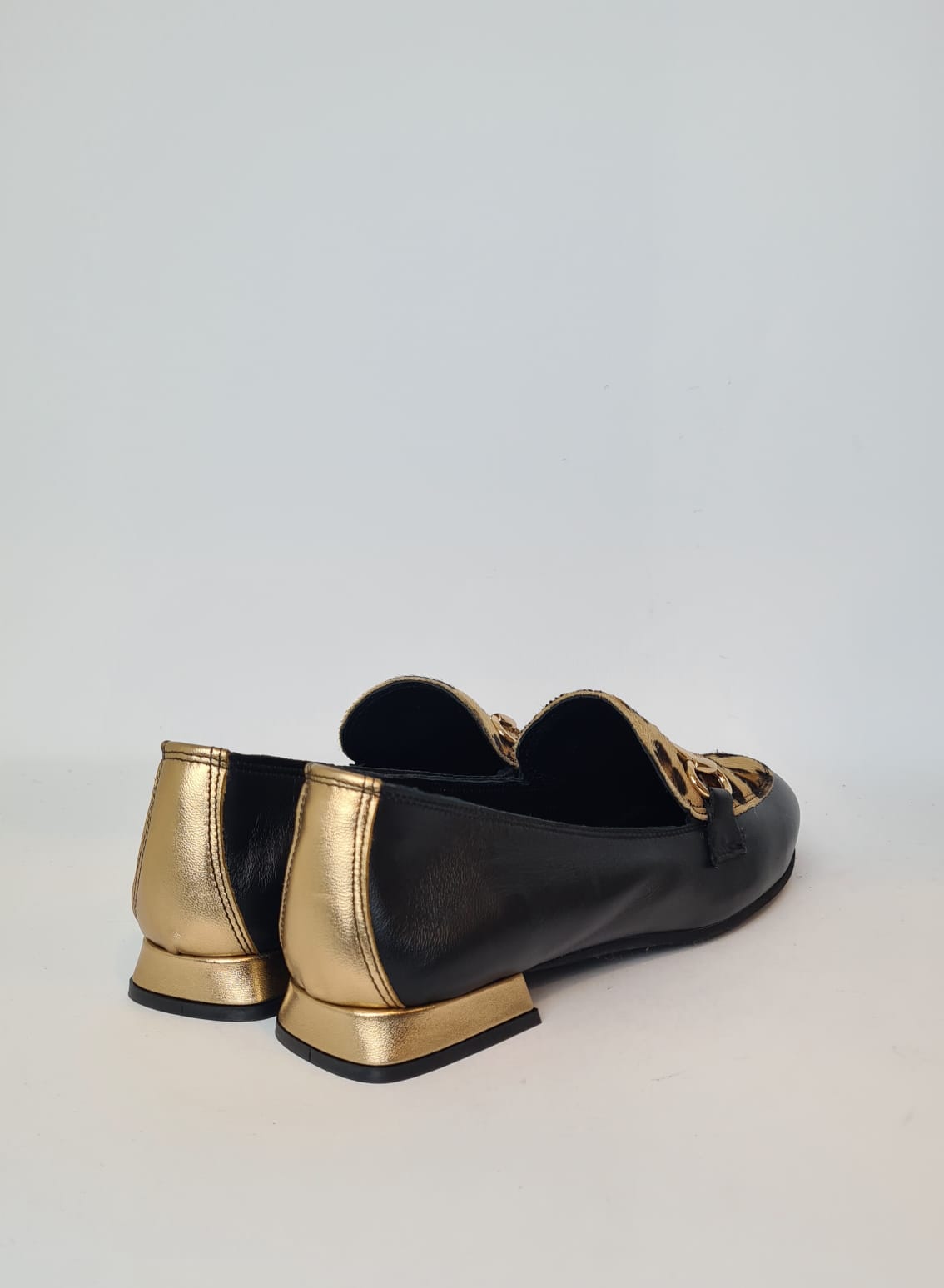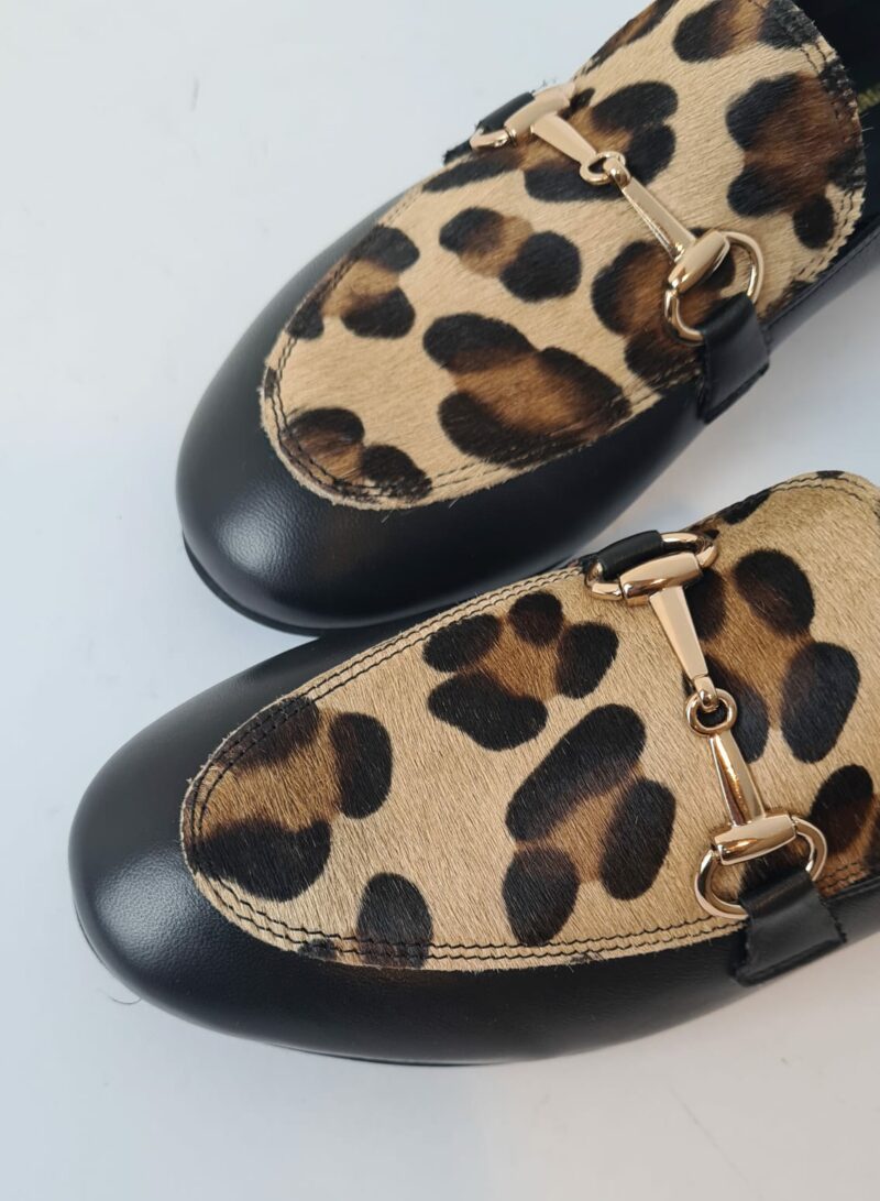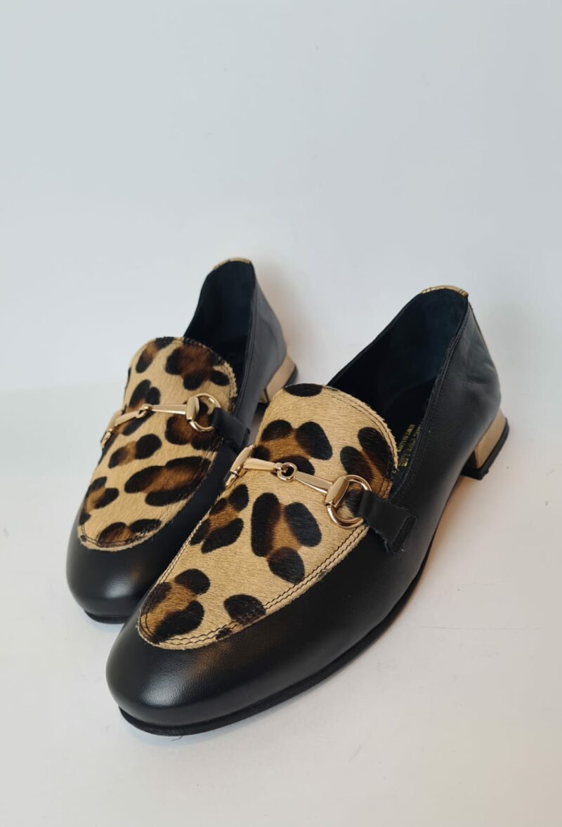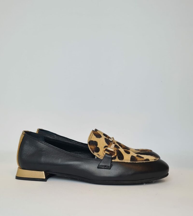 Mocassino con tomaia animalier e accessorio oro.