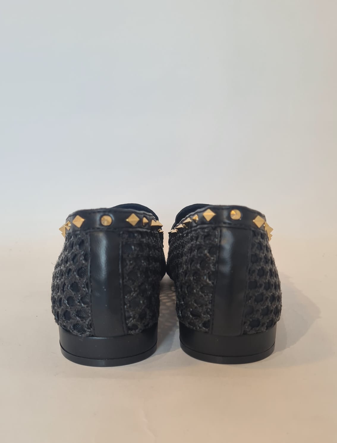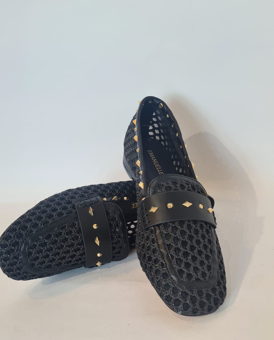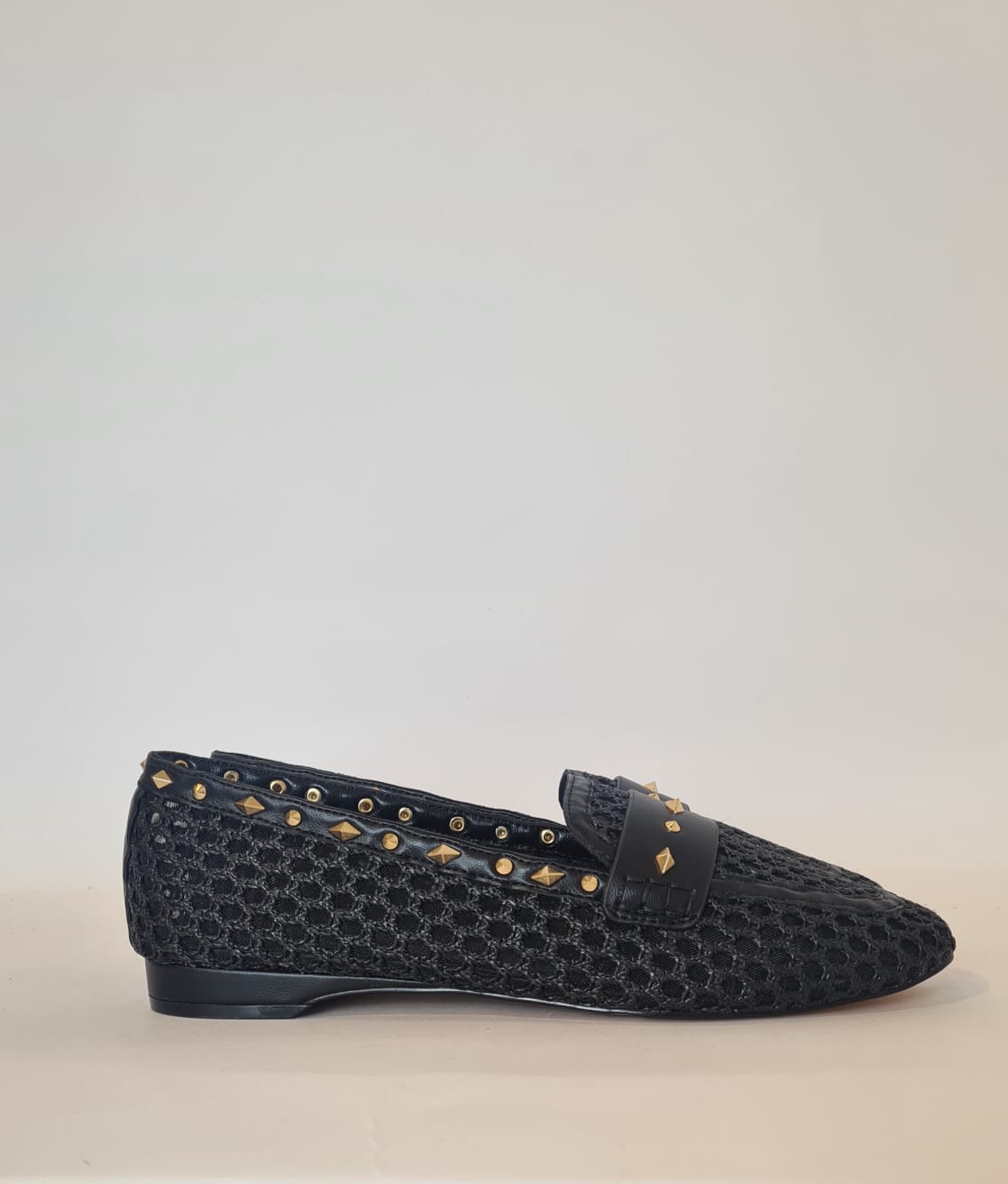 Mocassino in raffia, borchiette gold sui profili.