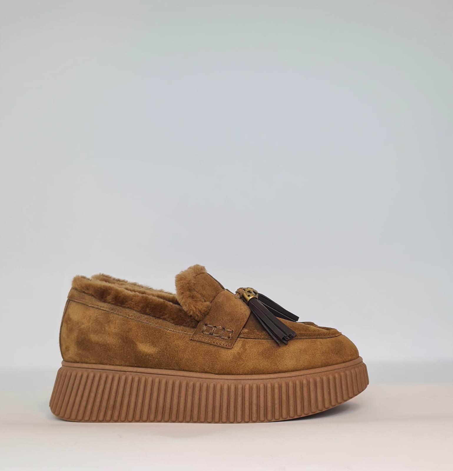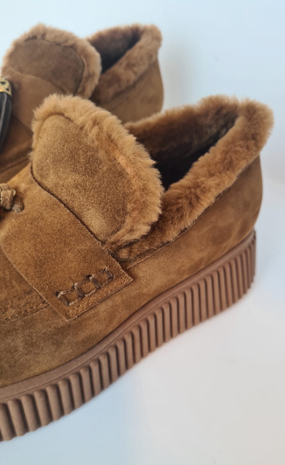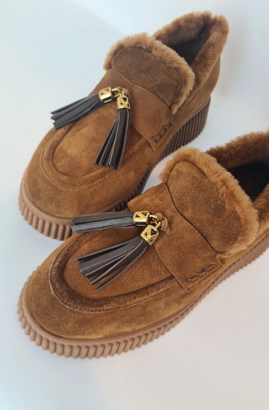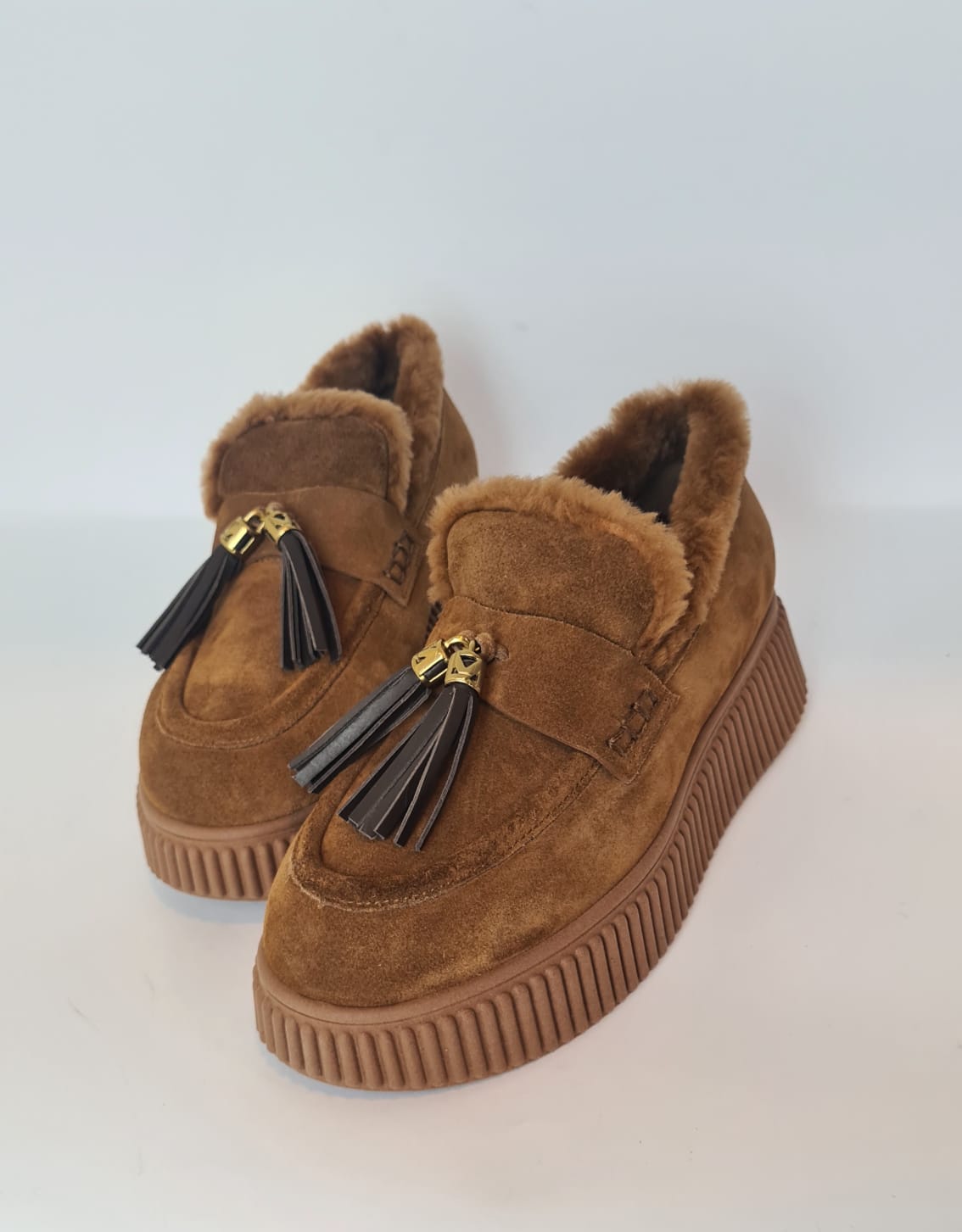 Mocassino di alta comodità realizzato con pellicciotto. Suola in gomma. Con nappine color testa di moro.
