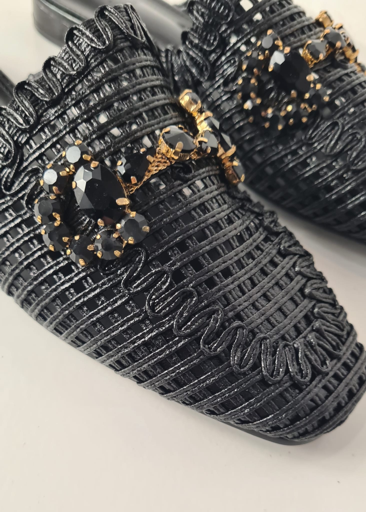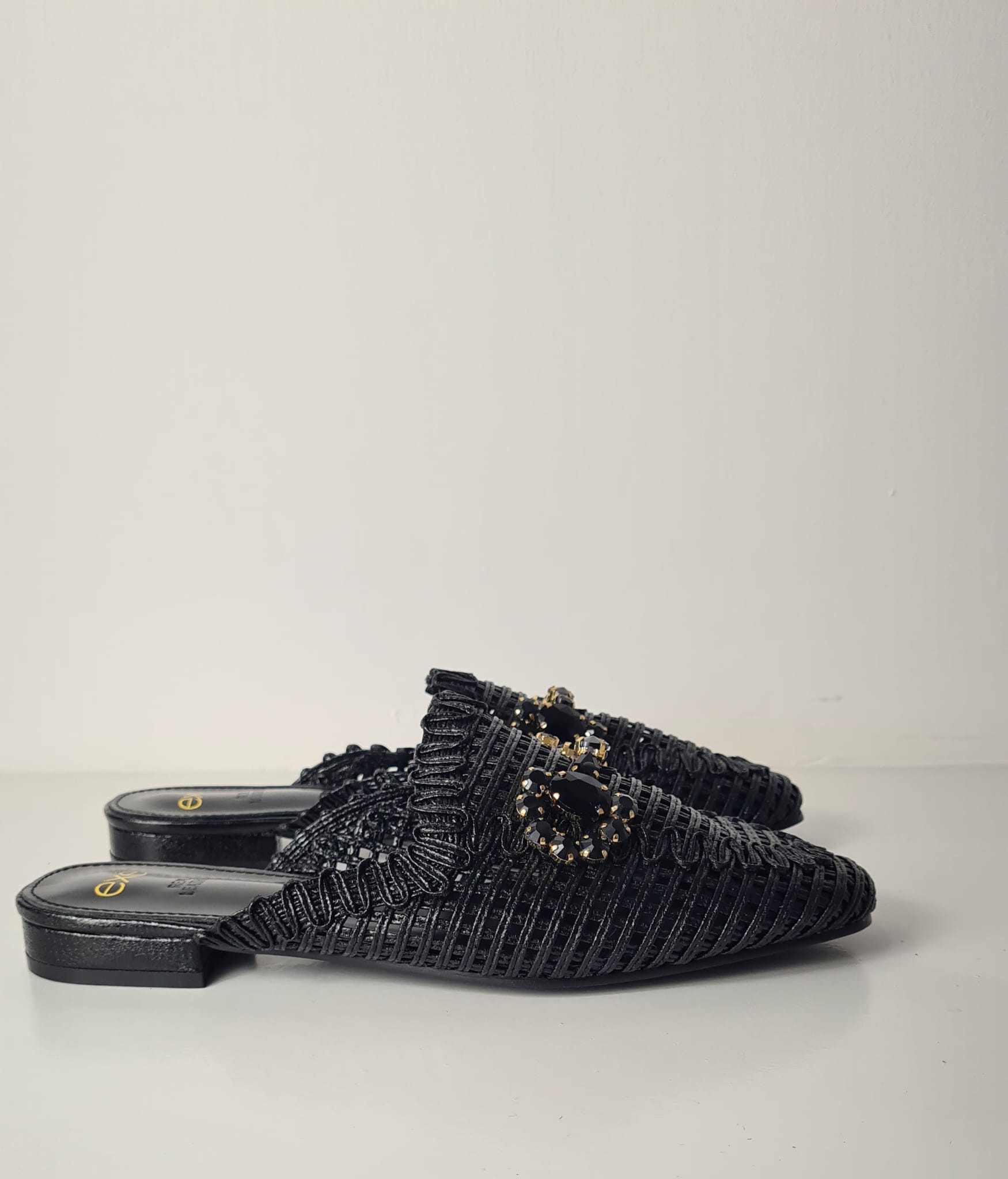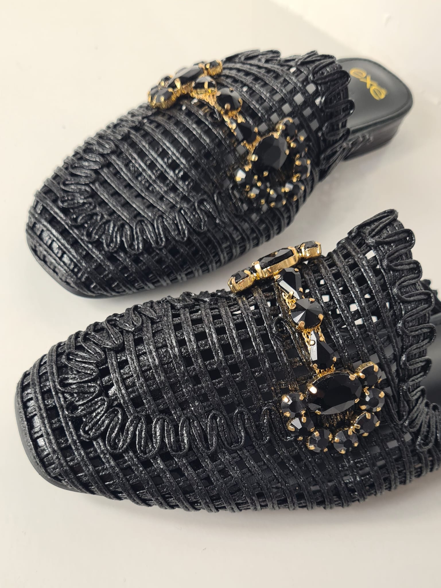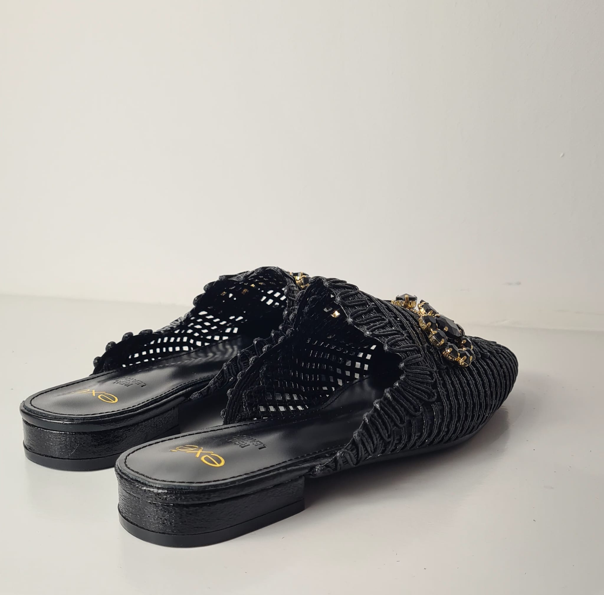 Sabot “EXE” in delicato intreccio con pietre decorative, perfetto in tutte le occasioni.