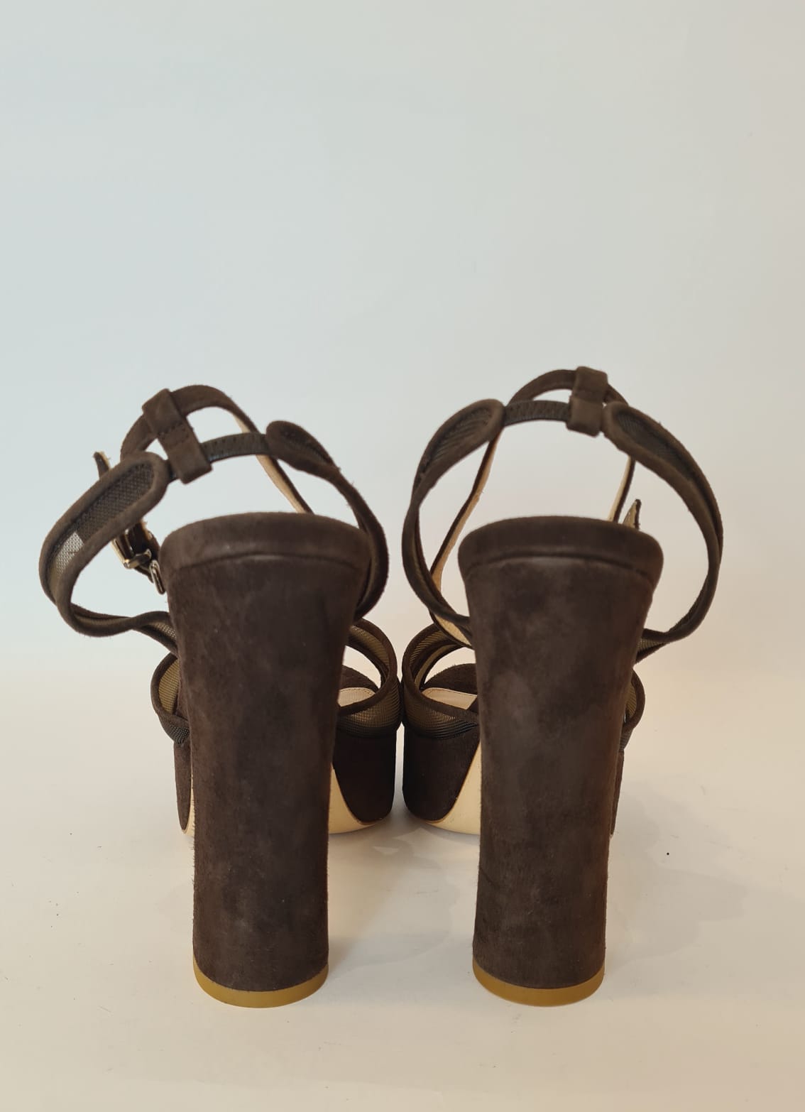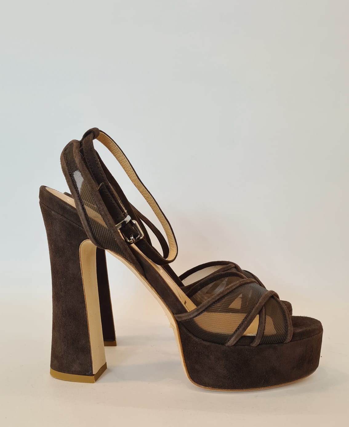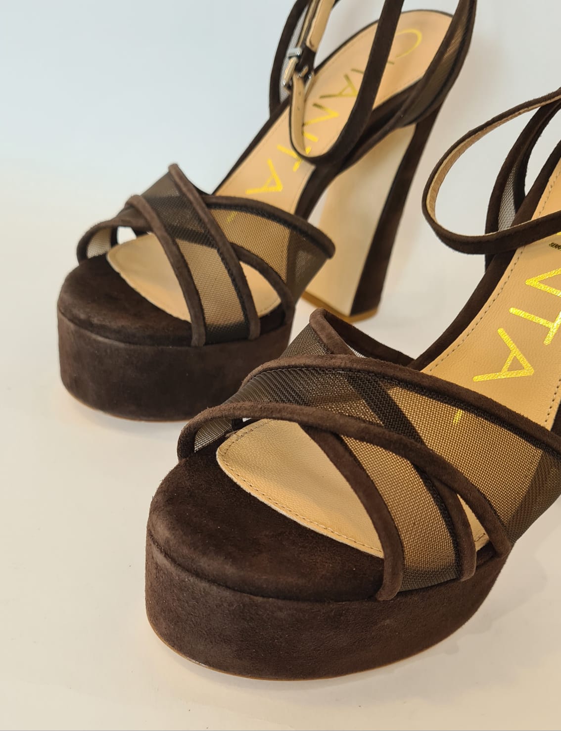 Sandali “Chantal” in camoscio e rete. Cinturino alla caviglia e plateau.