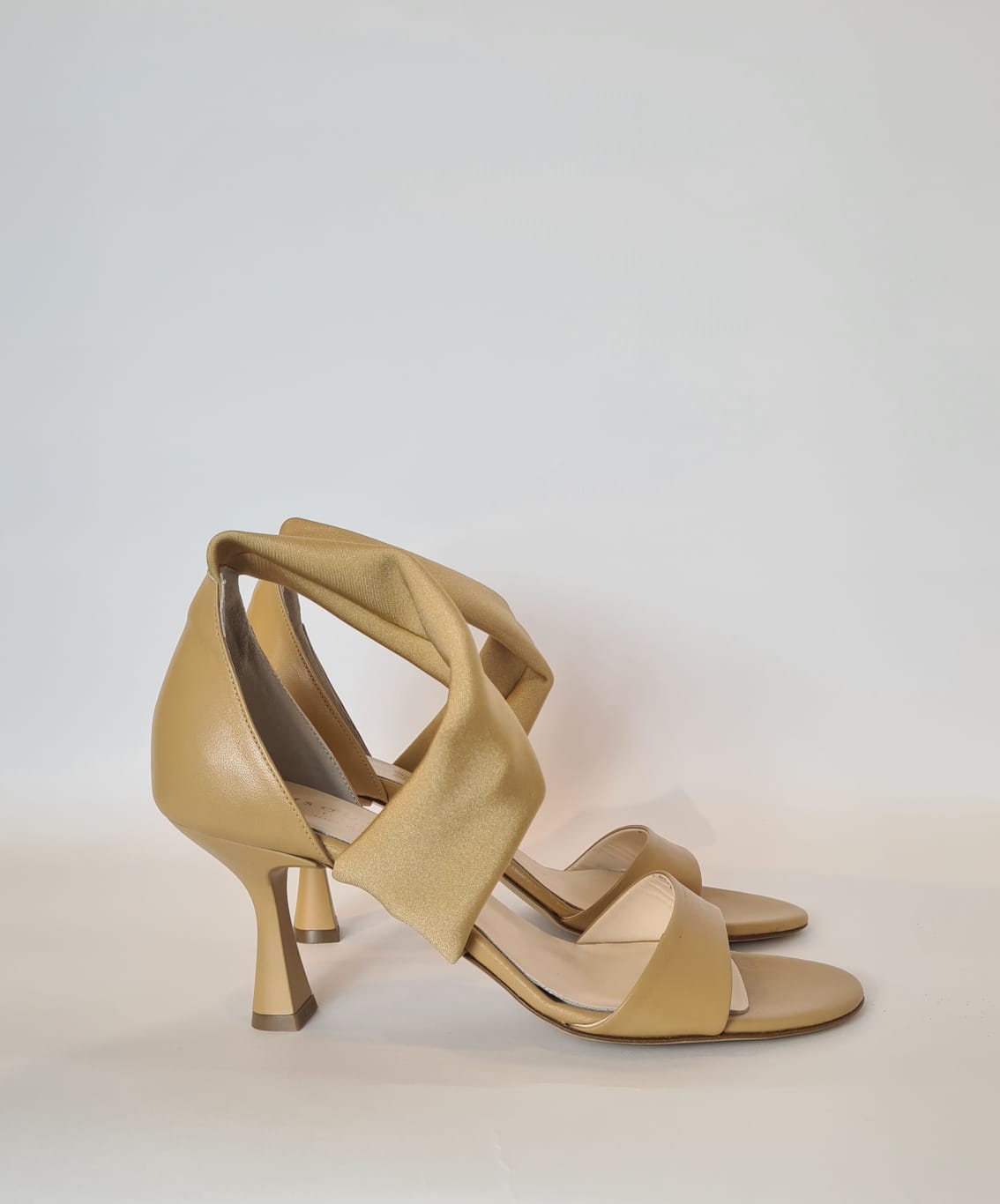 Sandali “Isabelle Paris” in pelle con fascia in tessuto elastico che segue il collo del piede.
