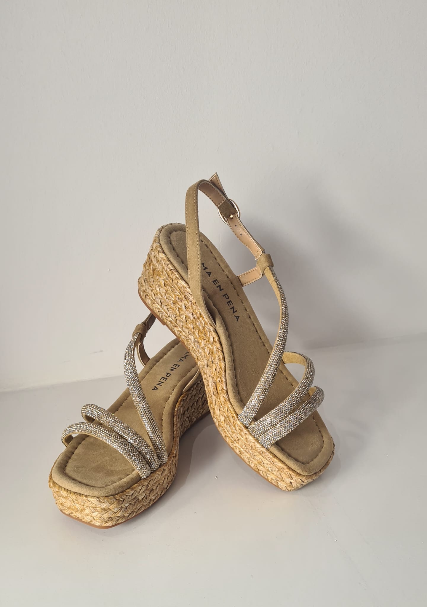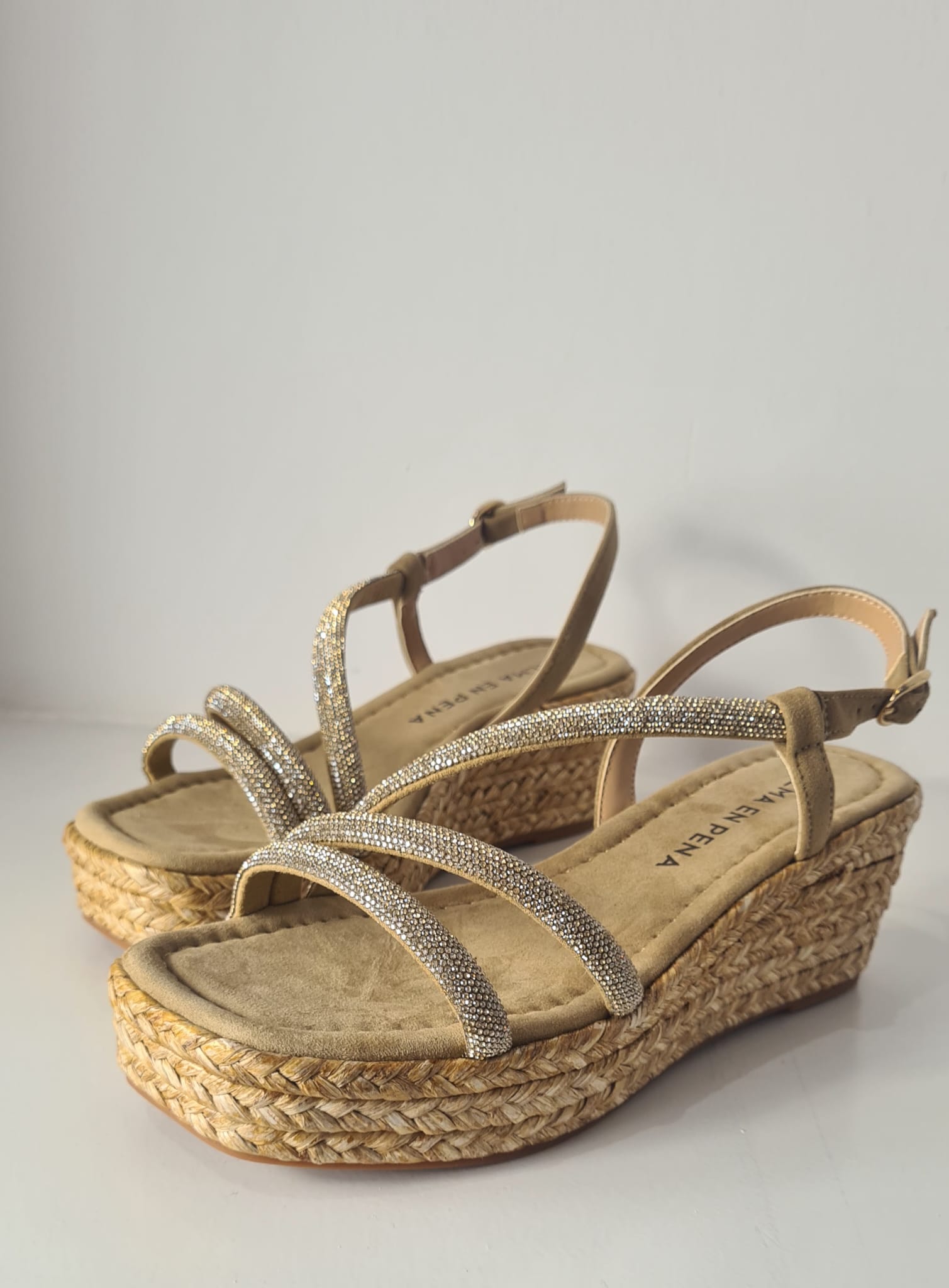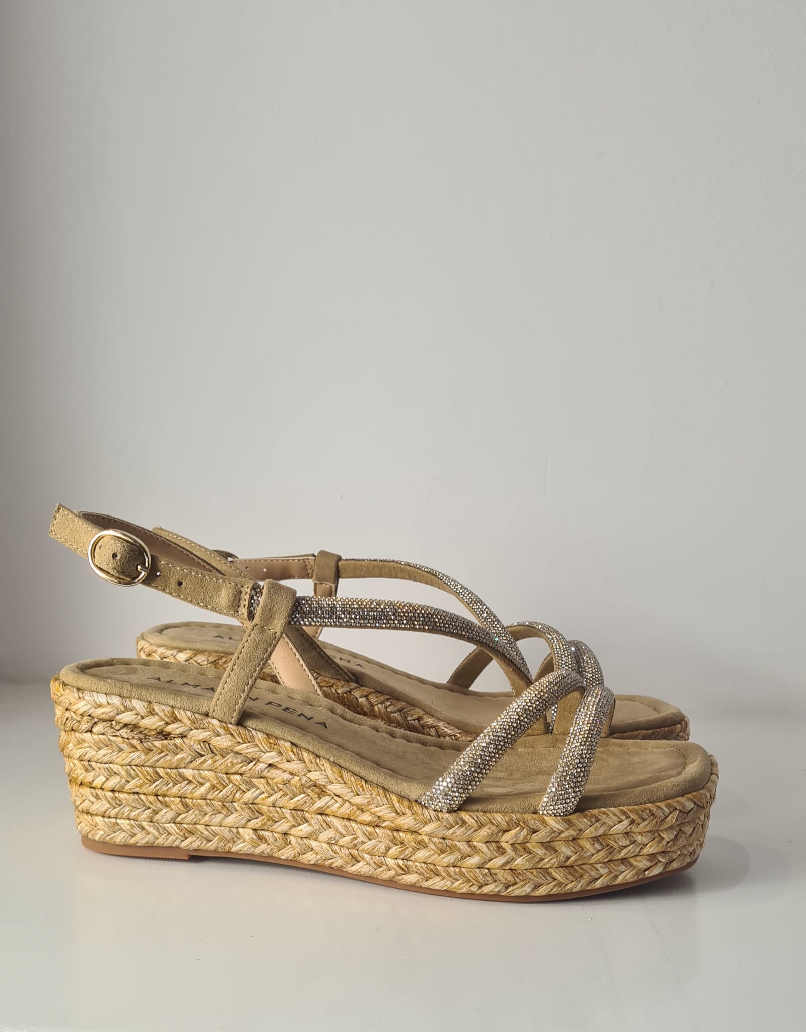 Sandalo con zeppa in corda (altezza 7 cm) e fasce coperte di strass.