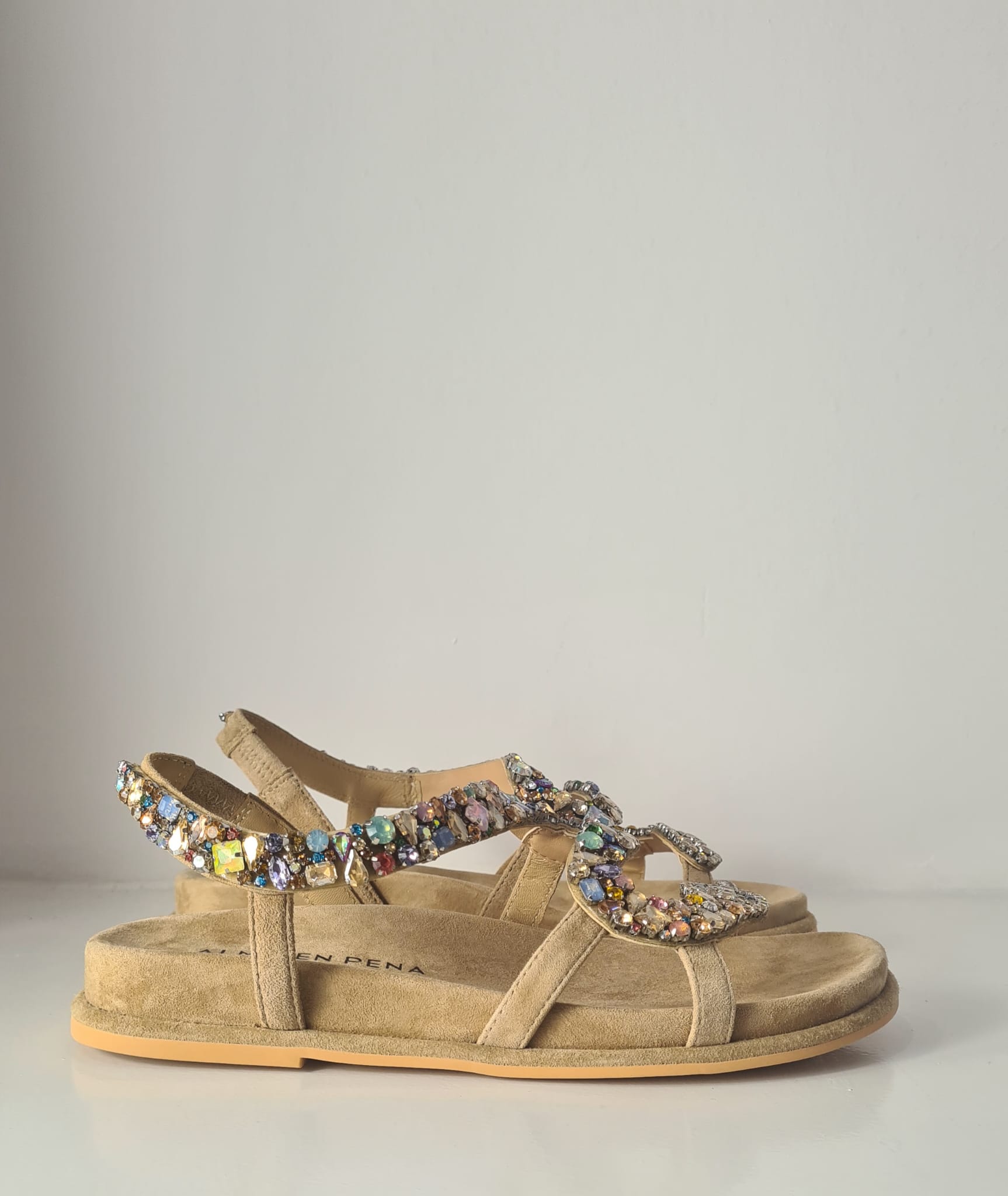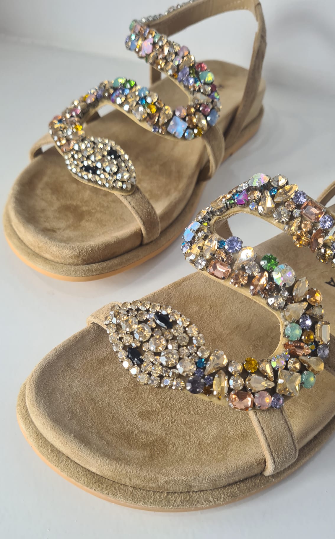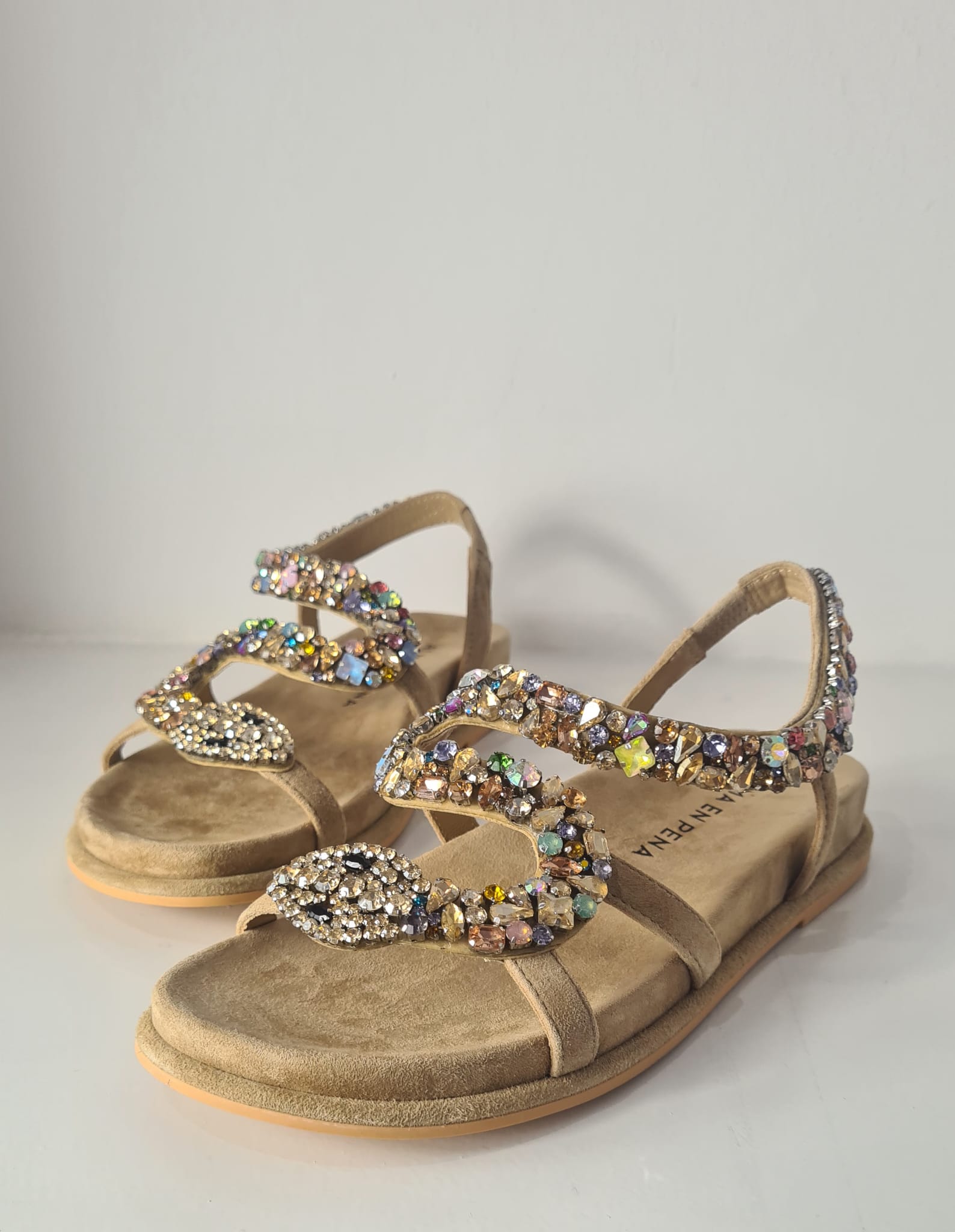 Sandalo flat in suede con serpente coperto di pietre colorate.