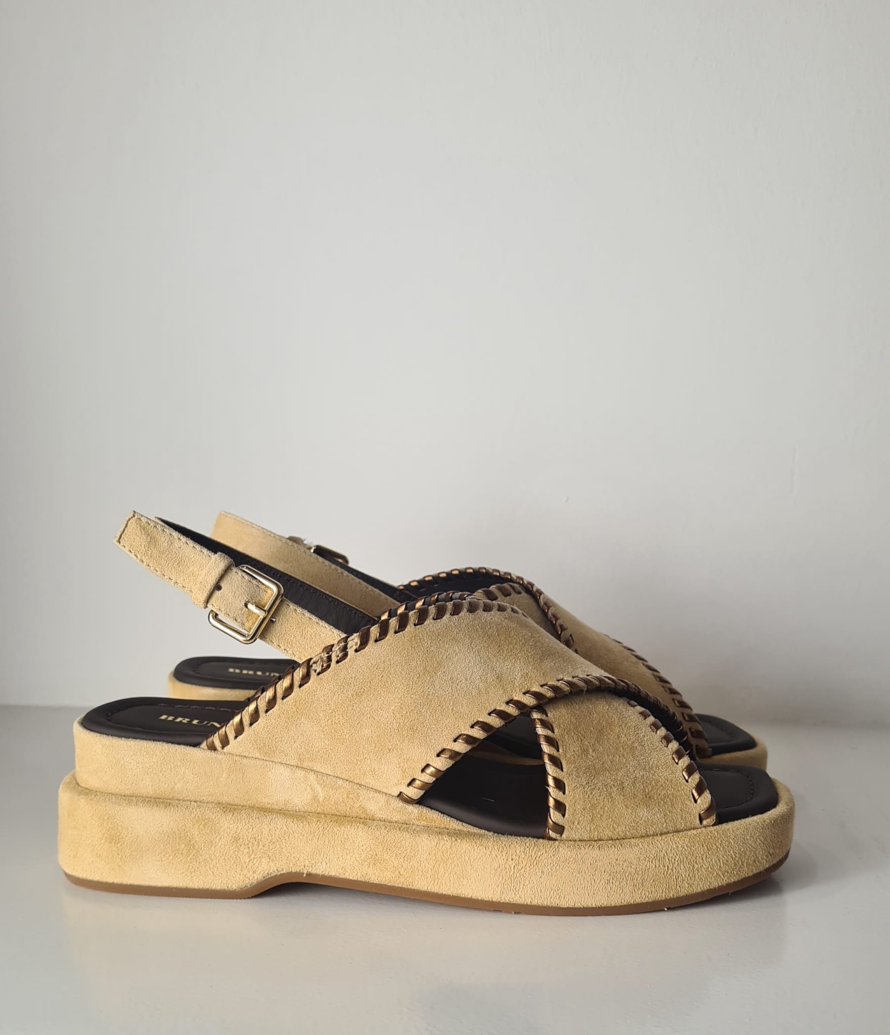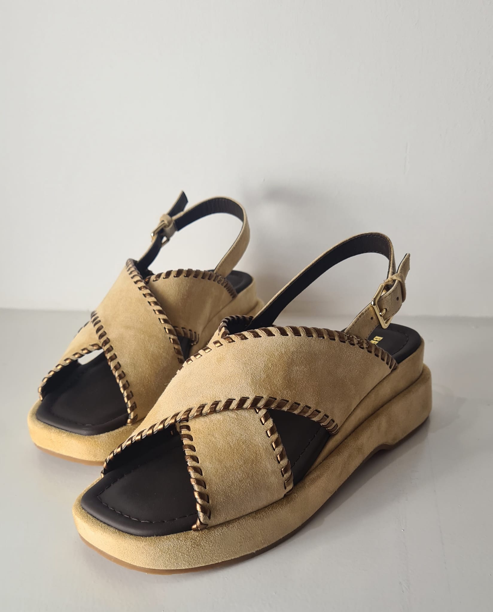 Sandalo “Bruno Premi” in pelle scamosciata con doppia fascia incrociata.