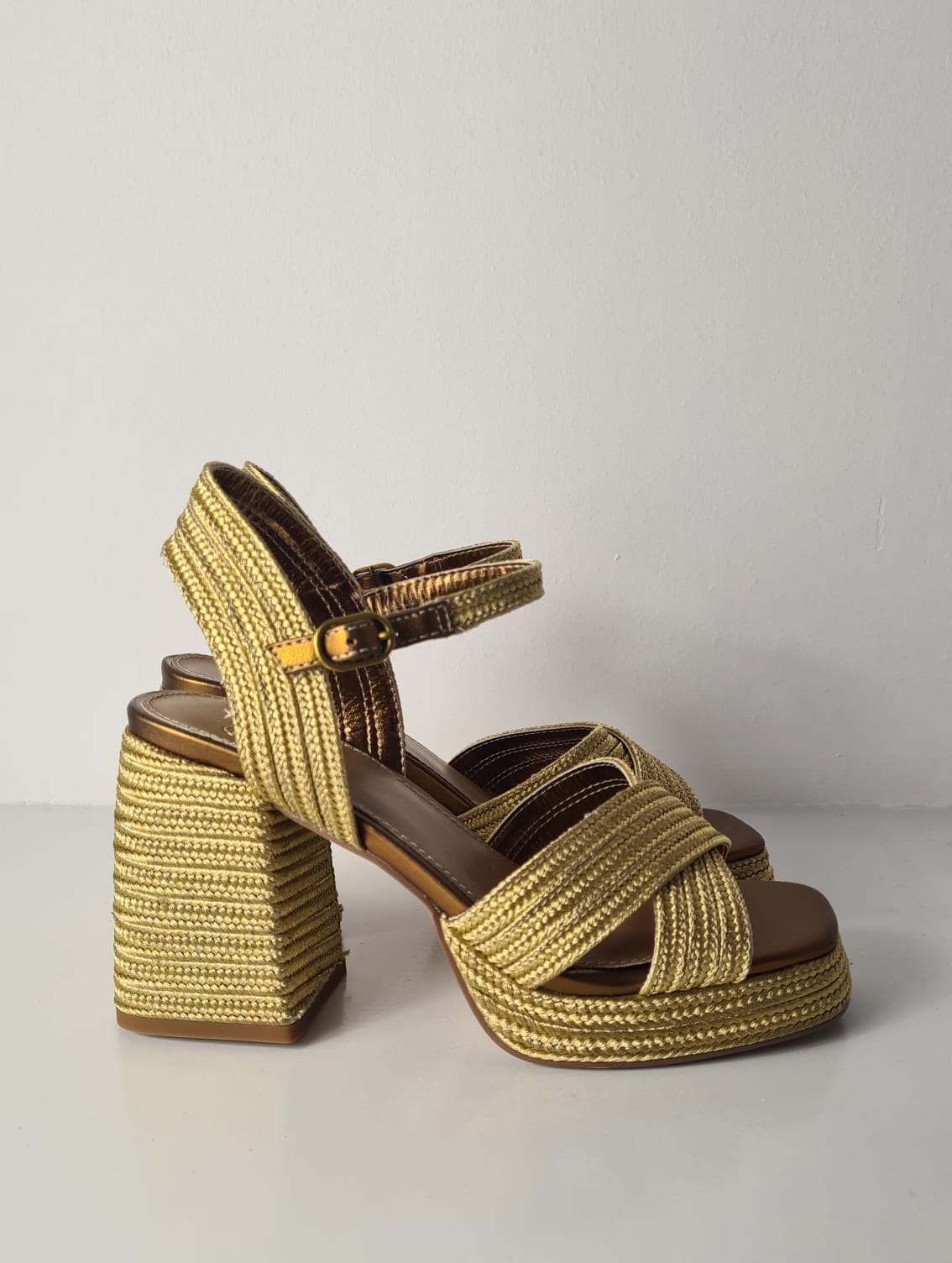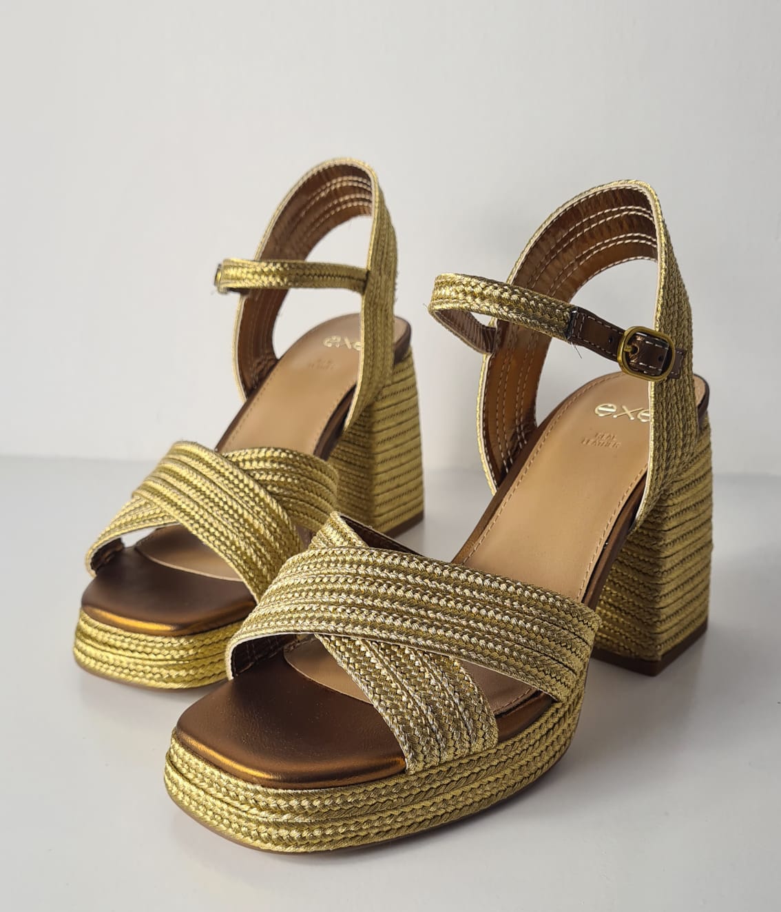 Sandalo “EXE” in corda con fasce incrociate, tacco largo 10 cm e plateau anteriore.