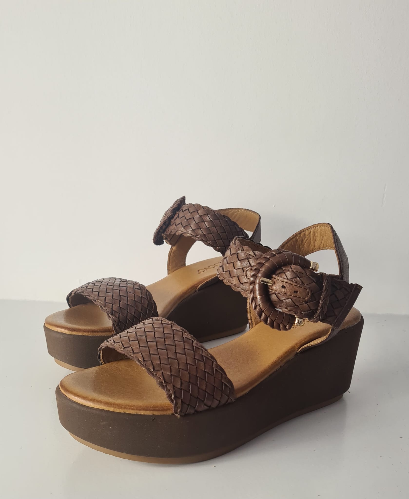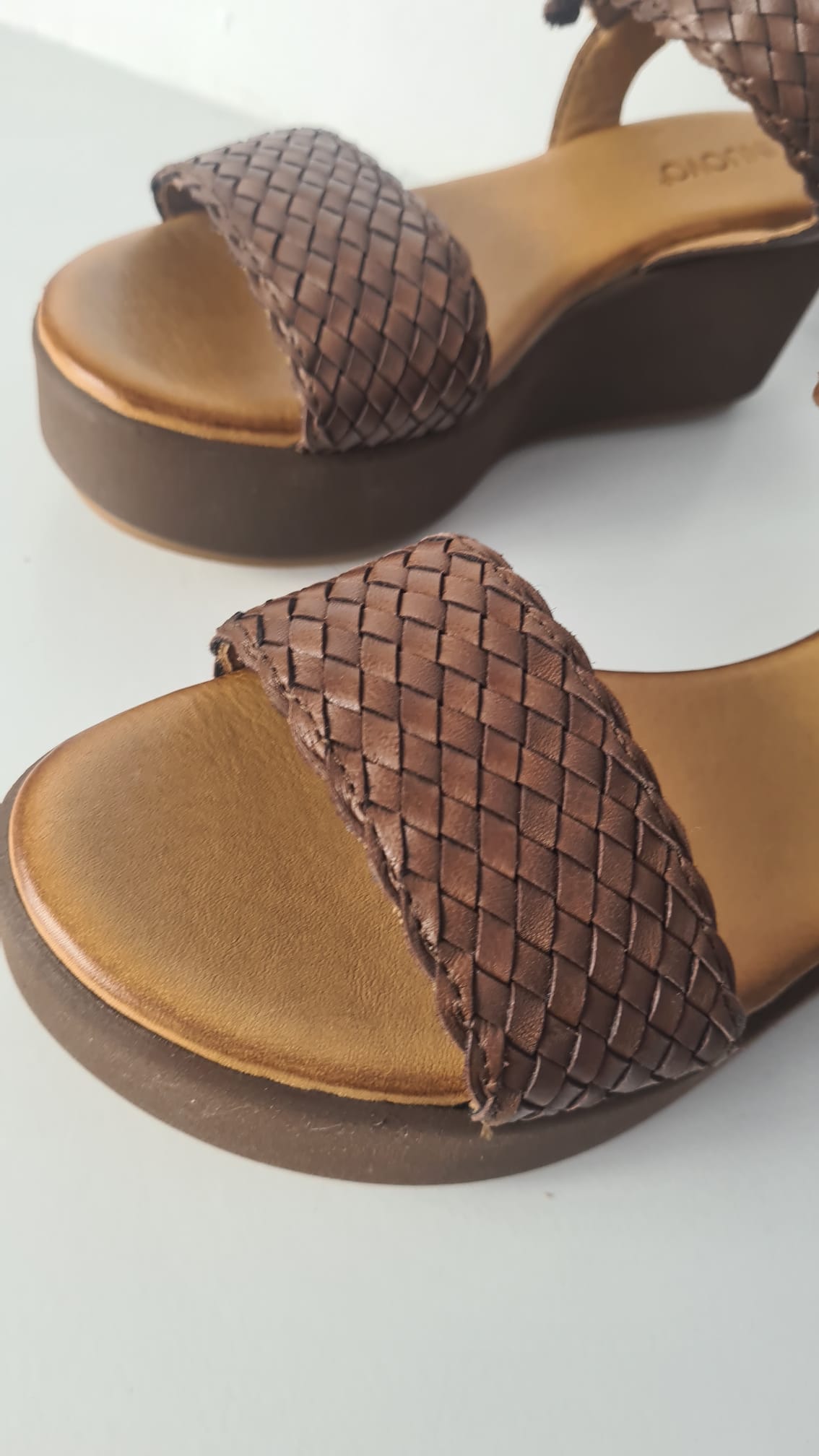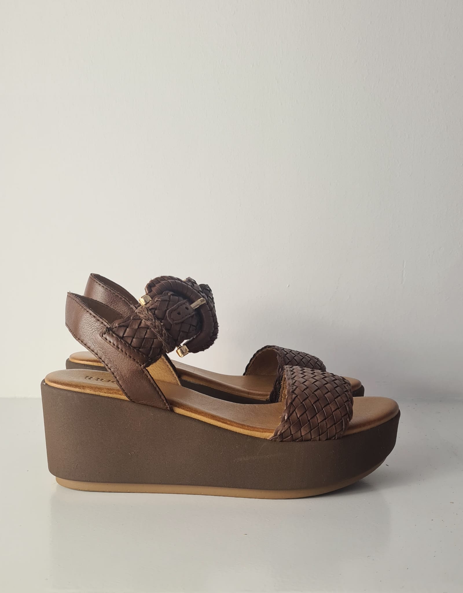 Sandalo “INUOVO” in pelle intrecciata e zeppa.