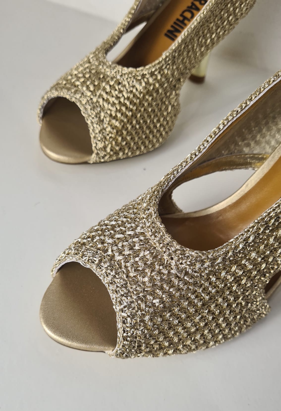 Sandalo “Luciano Barachini” con tomaia in tessuto intrecciato lurex. Design semi aperto, avvolgente lateralmente.
