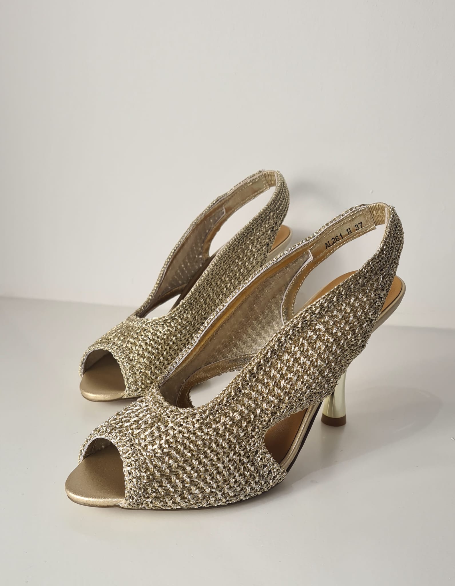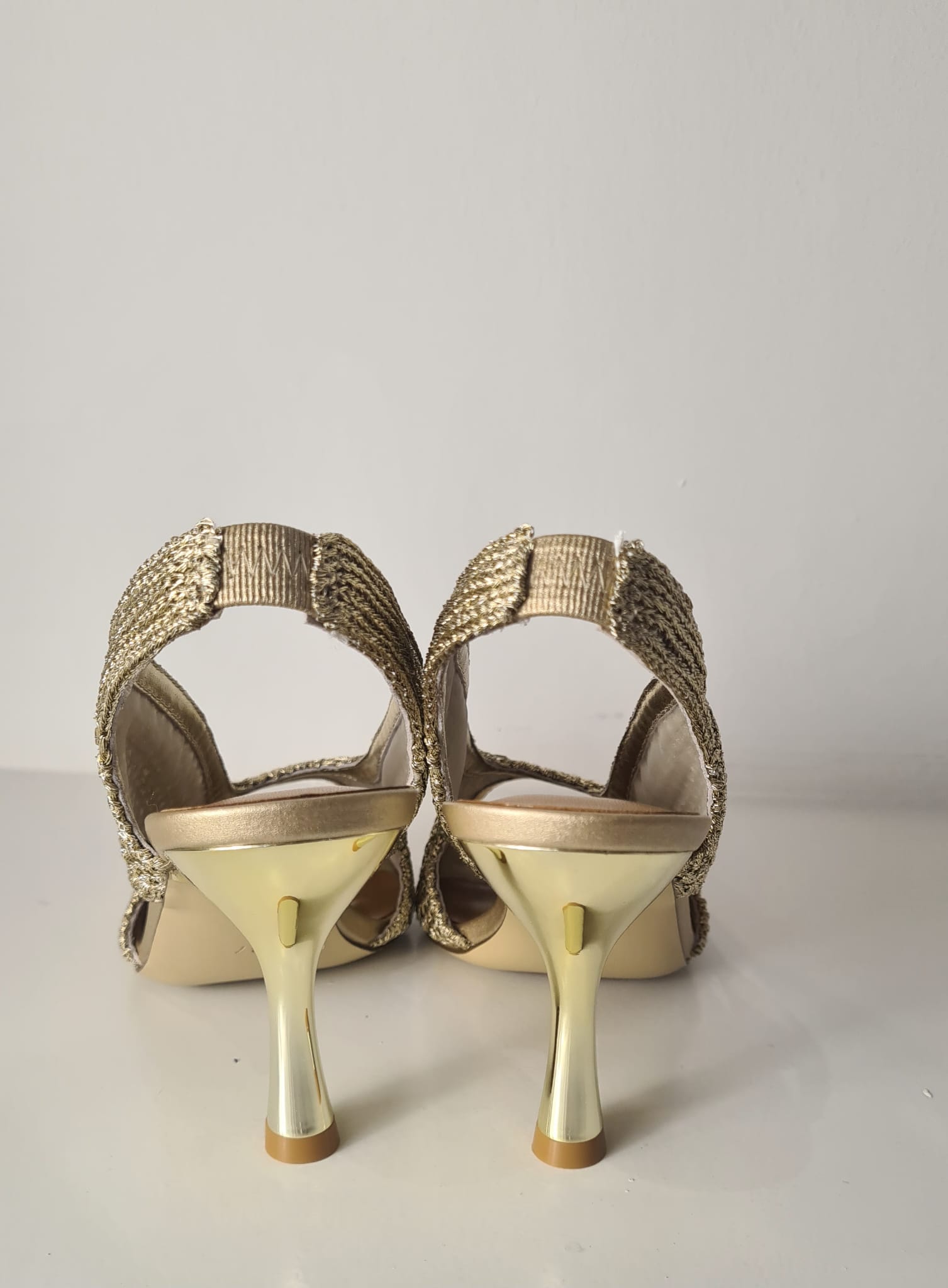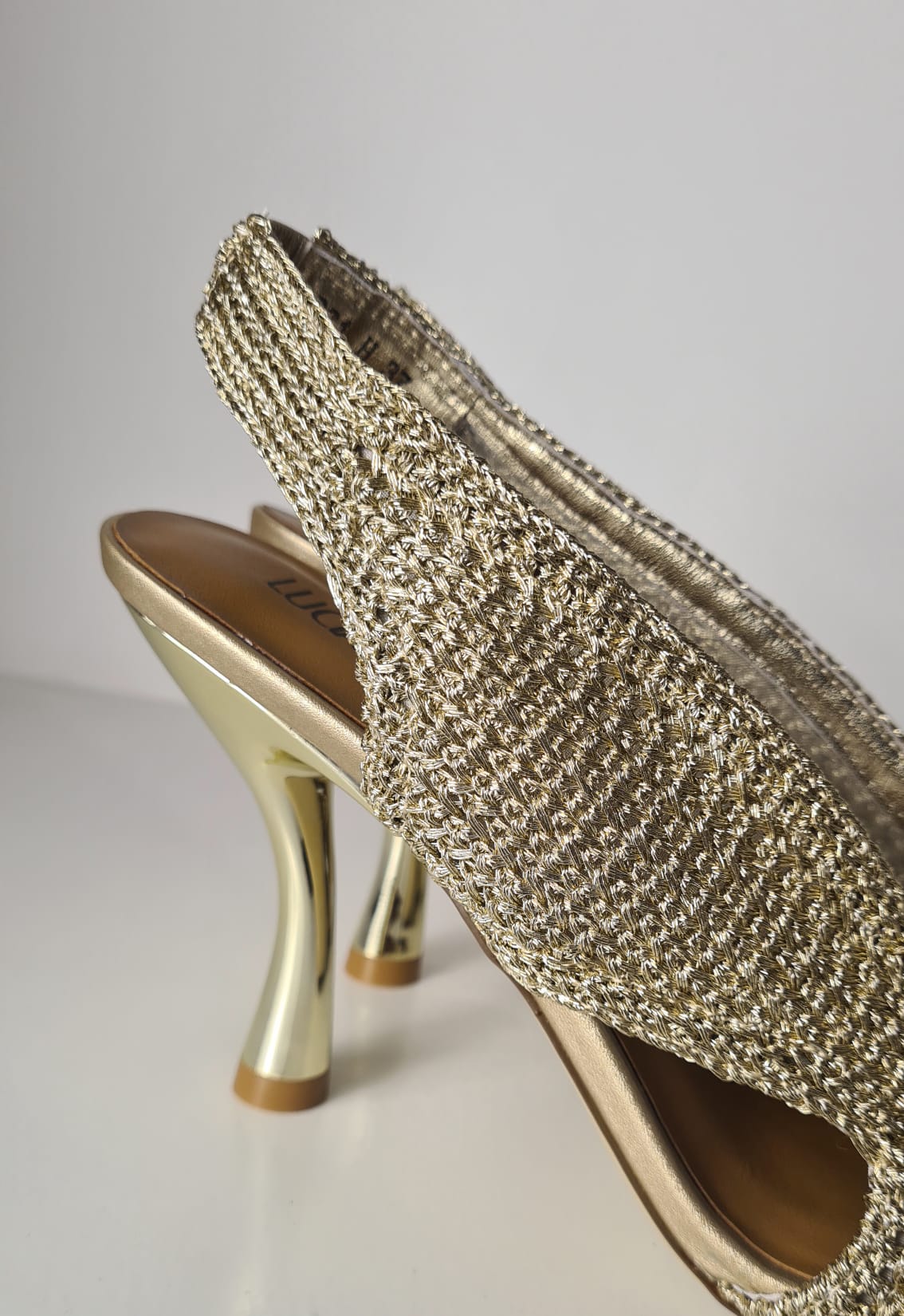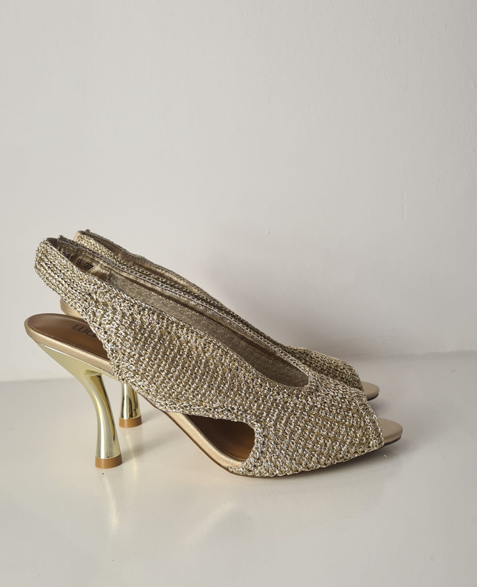 Tacco oro lucido, altezza 9 cm. Dettagli dorati.