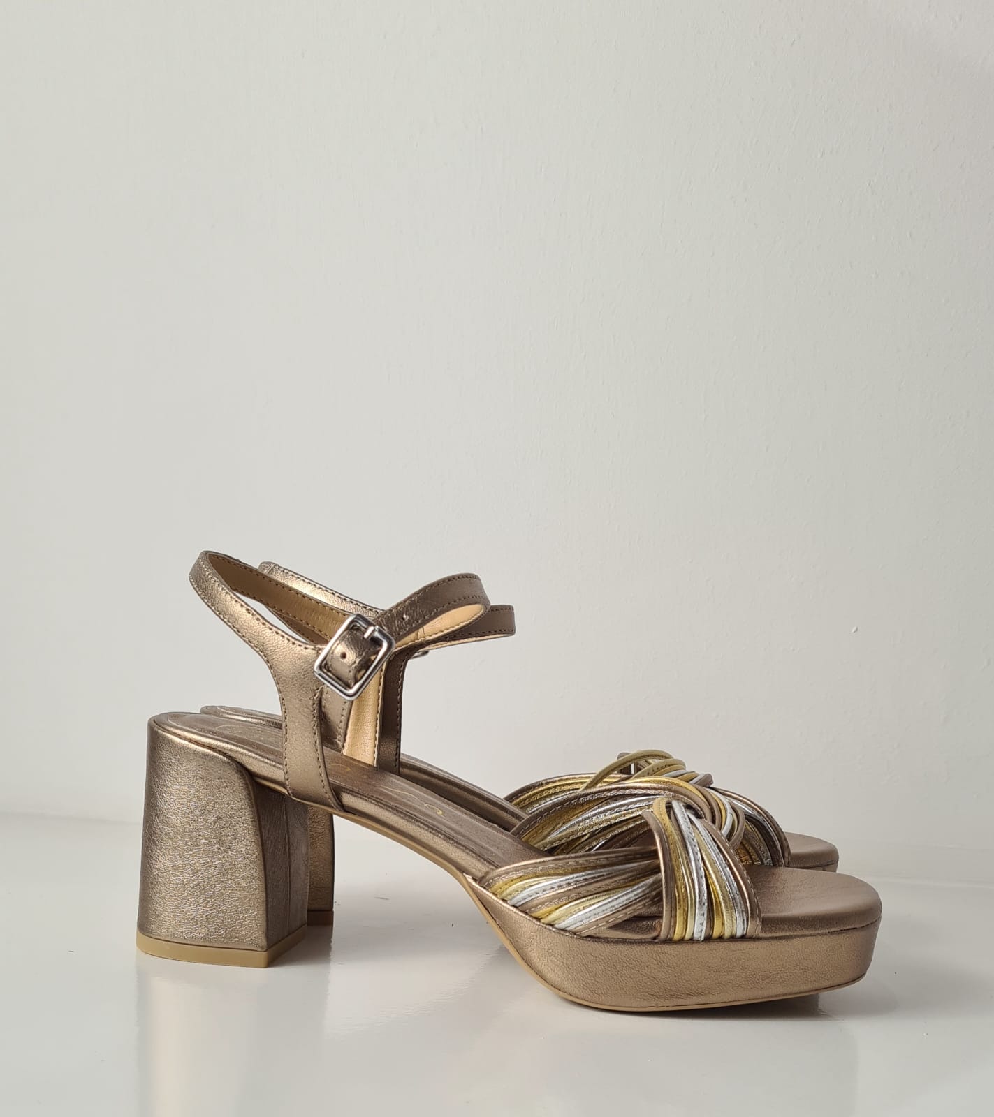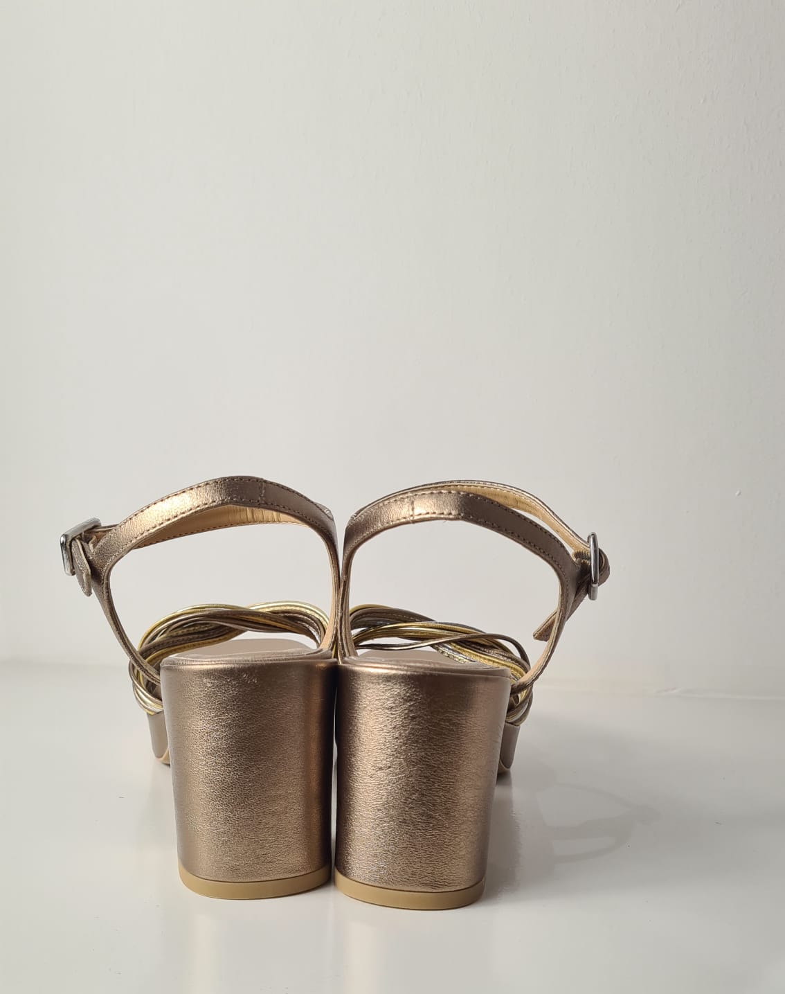 Tacco e plateau color bronzo che lo rendono particolarmente confortevole.