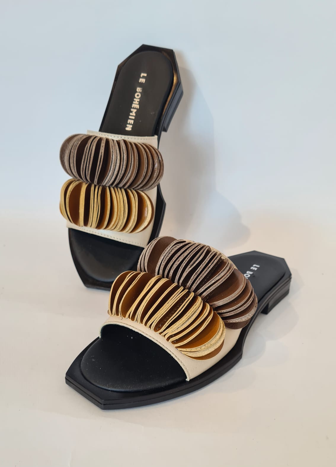 Scalzata “Le Bohémien” con tomaia in vitello naturale e fondo in gomma.