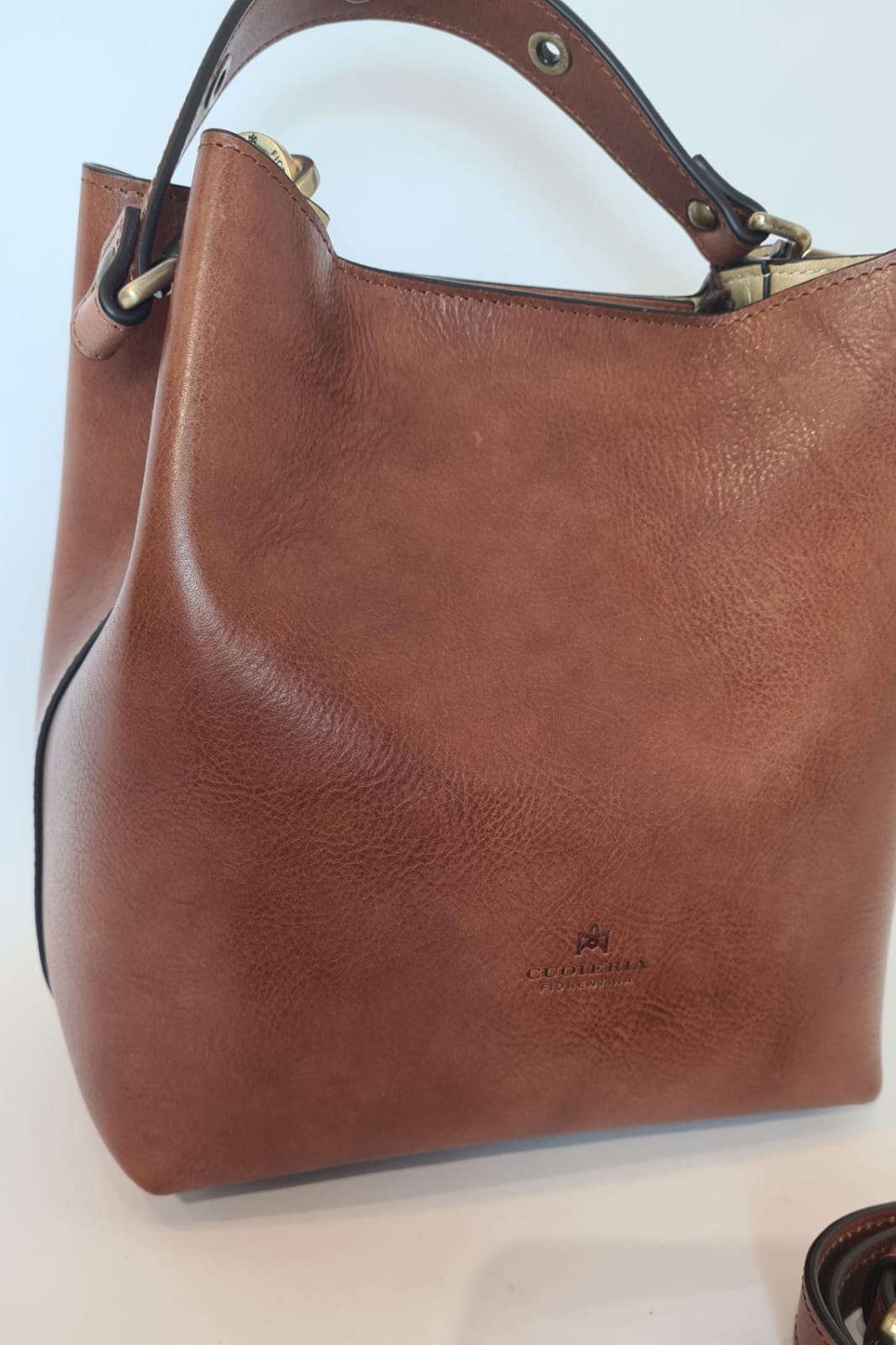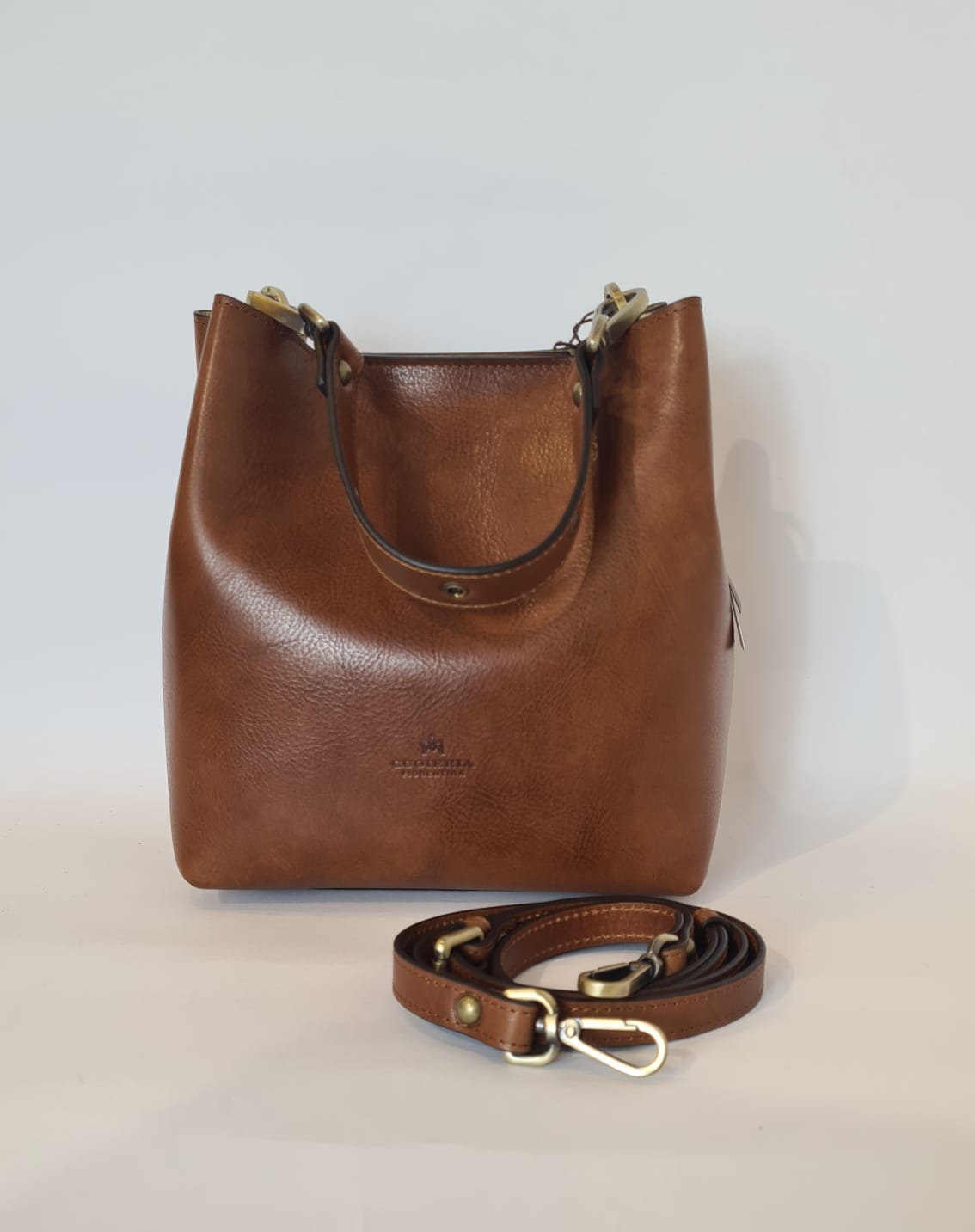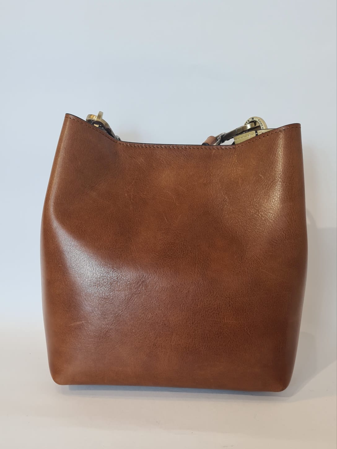 Secchiello in pelle ingrassata con singolo scomparto con taschino rimovibile. Manico con borchie e tracolla regolabile e rimovibile. Logo esterno stampato a fuoco. Chiusura con doppio bottone magnetico.