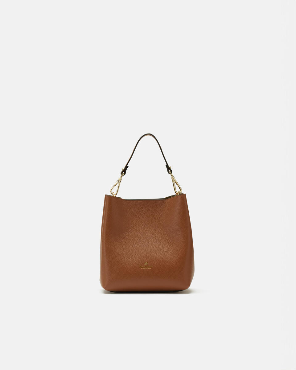 Secchiello in pelle con singolo scomparto con taschino rimovibile. Manico con borchie e tracolla regolabile e rimovibile. Logo esterno stampato a fuoco colore oro. Chiusura con doppio bottone magnetico color oro.