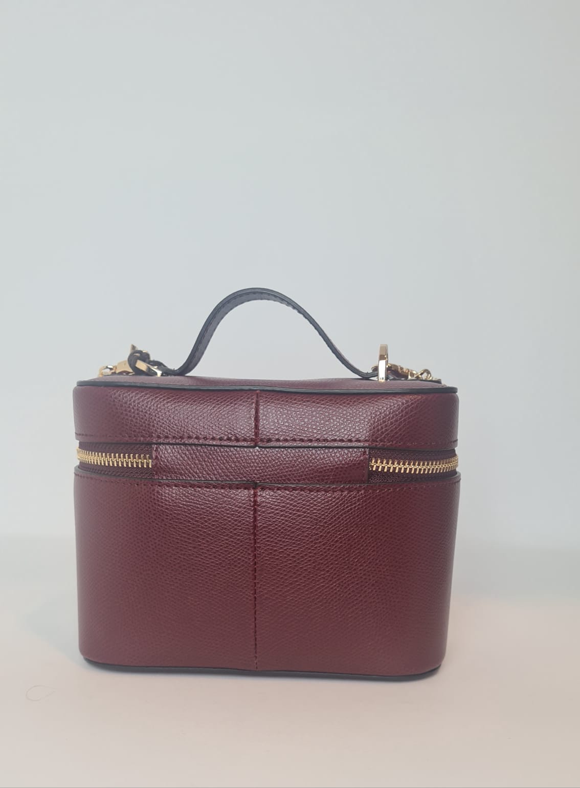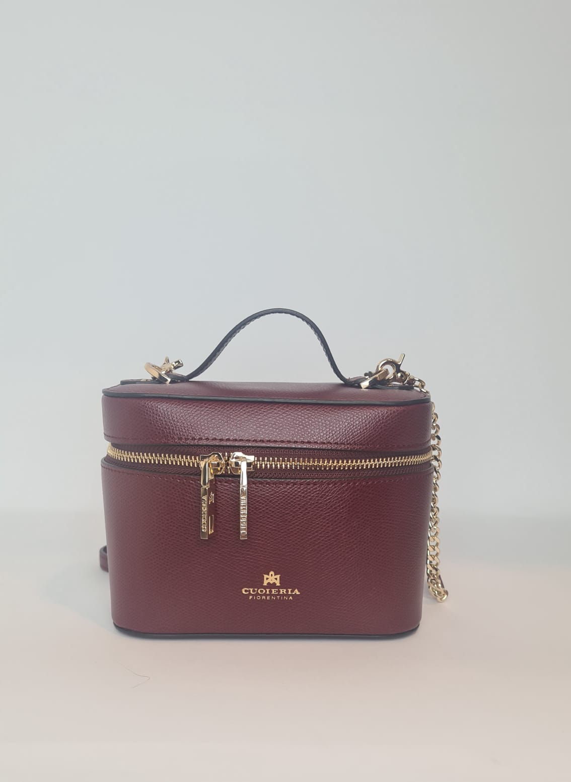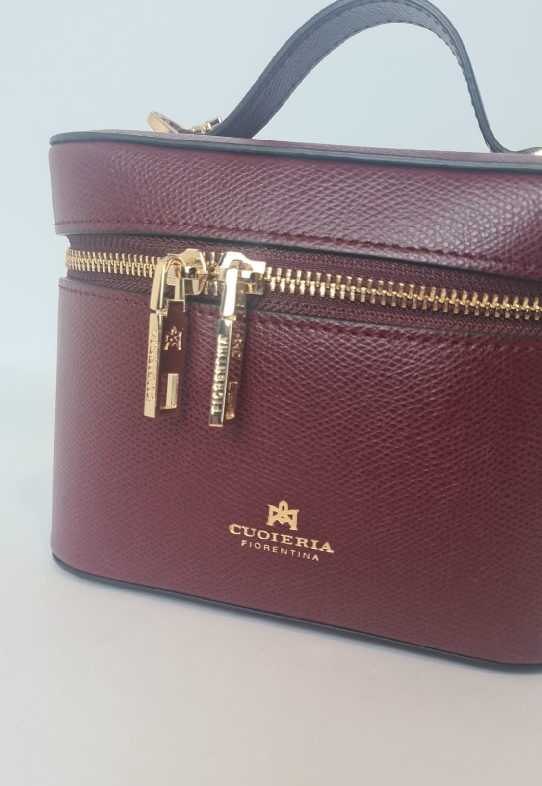 Small Beauty Case in pelle, rigido e compatto. Ideale per le uscite, dotato di tracolla rimovibile. Inserti dorati.