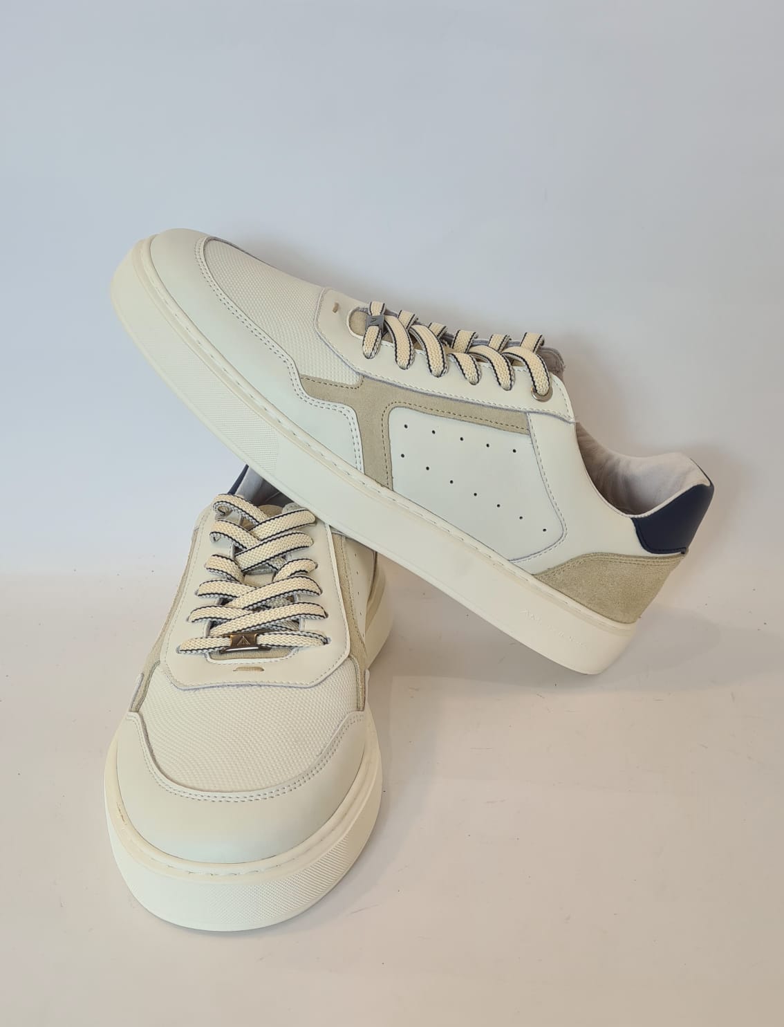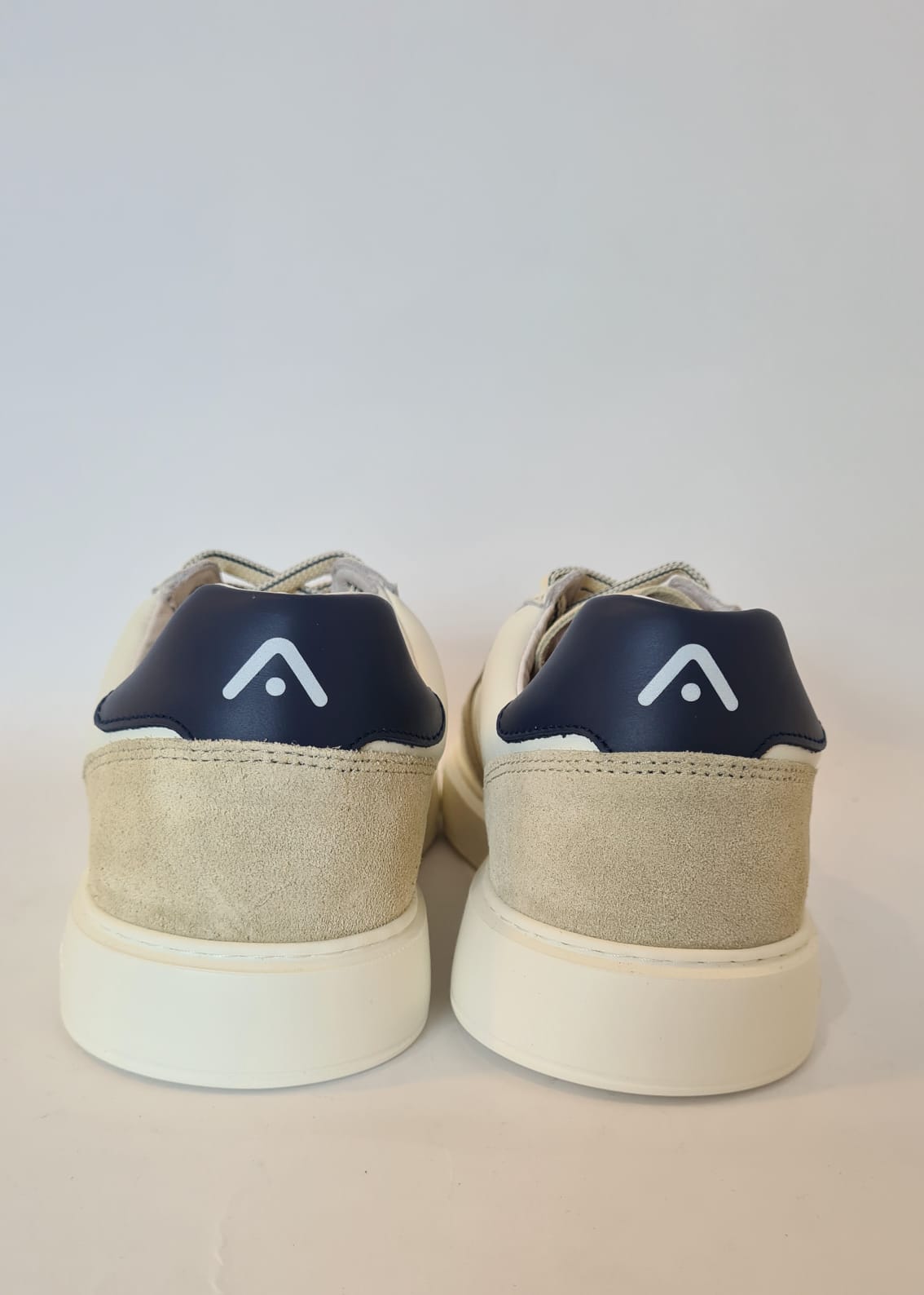 Tomaia bianca con inserto scamosciato taupe.