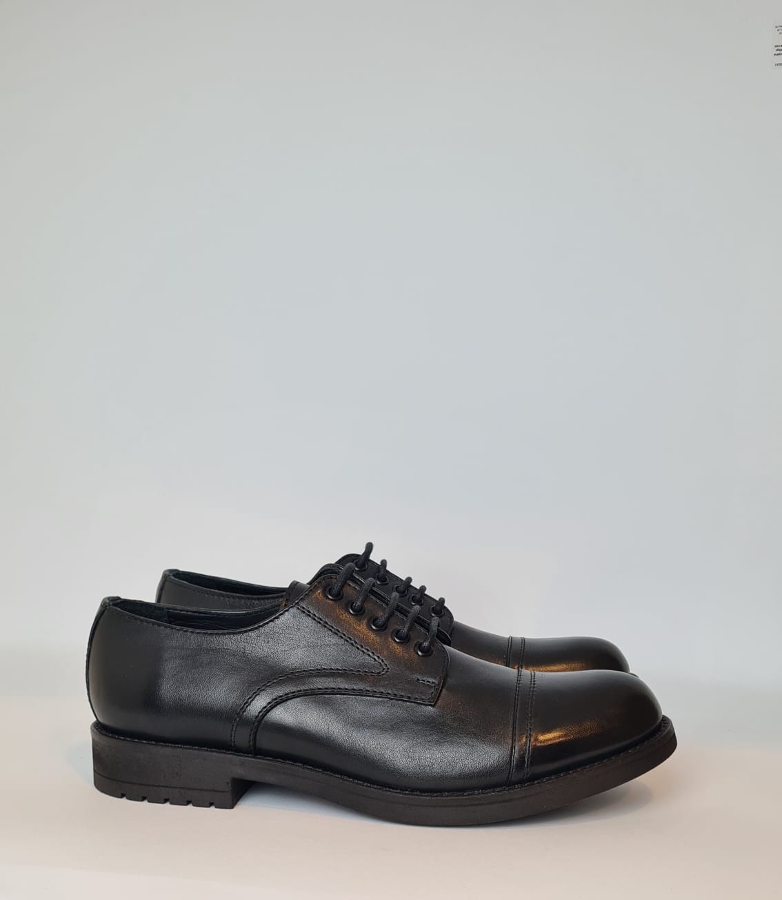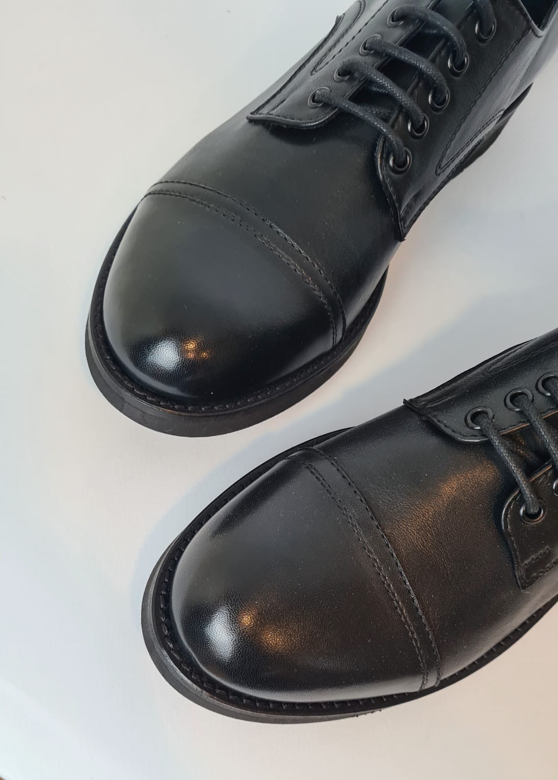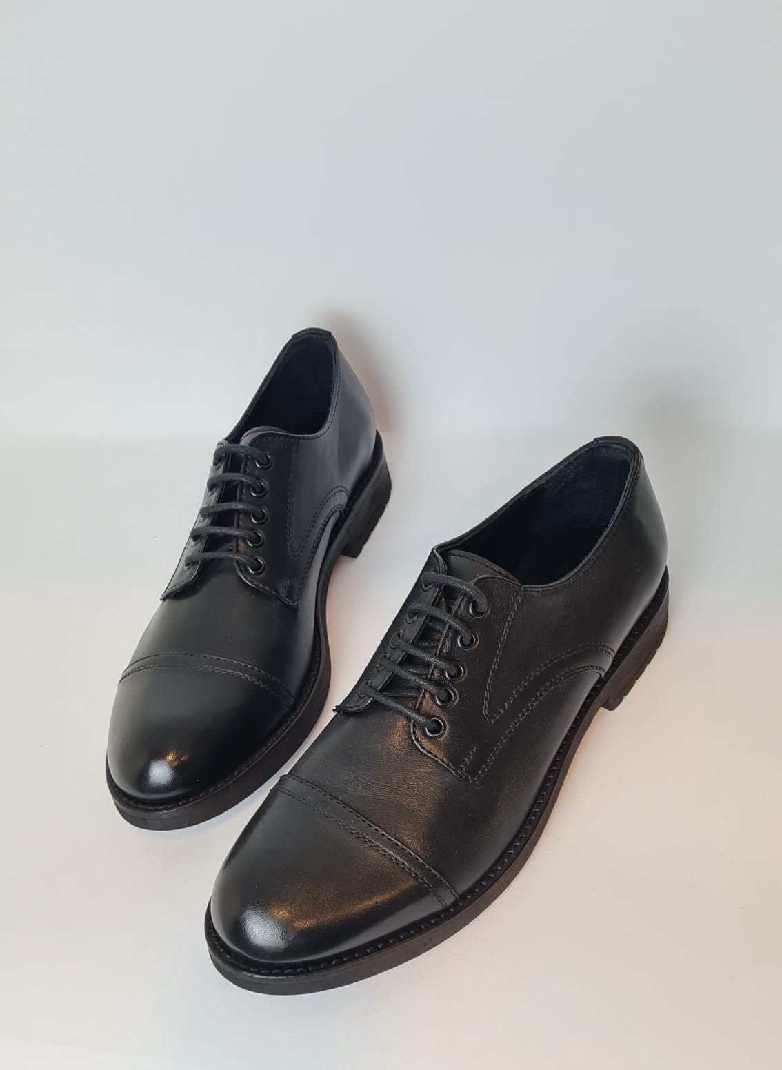 Stringata “JP/DAVID” in pelle, fondo scuro a contrasto che richiama le sfumature sulla tomaia della scarpa.