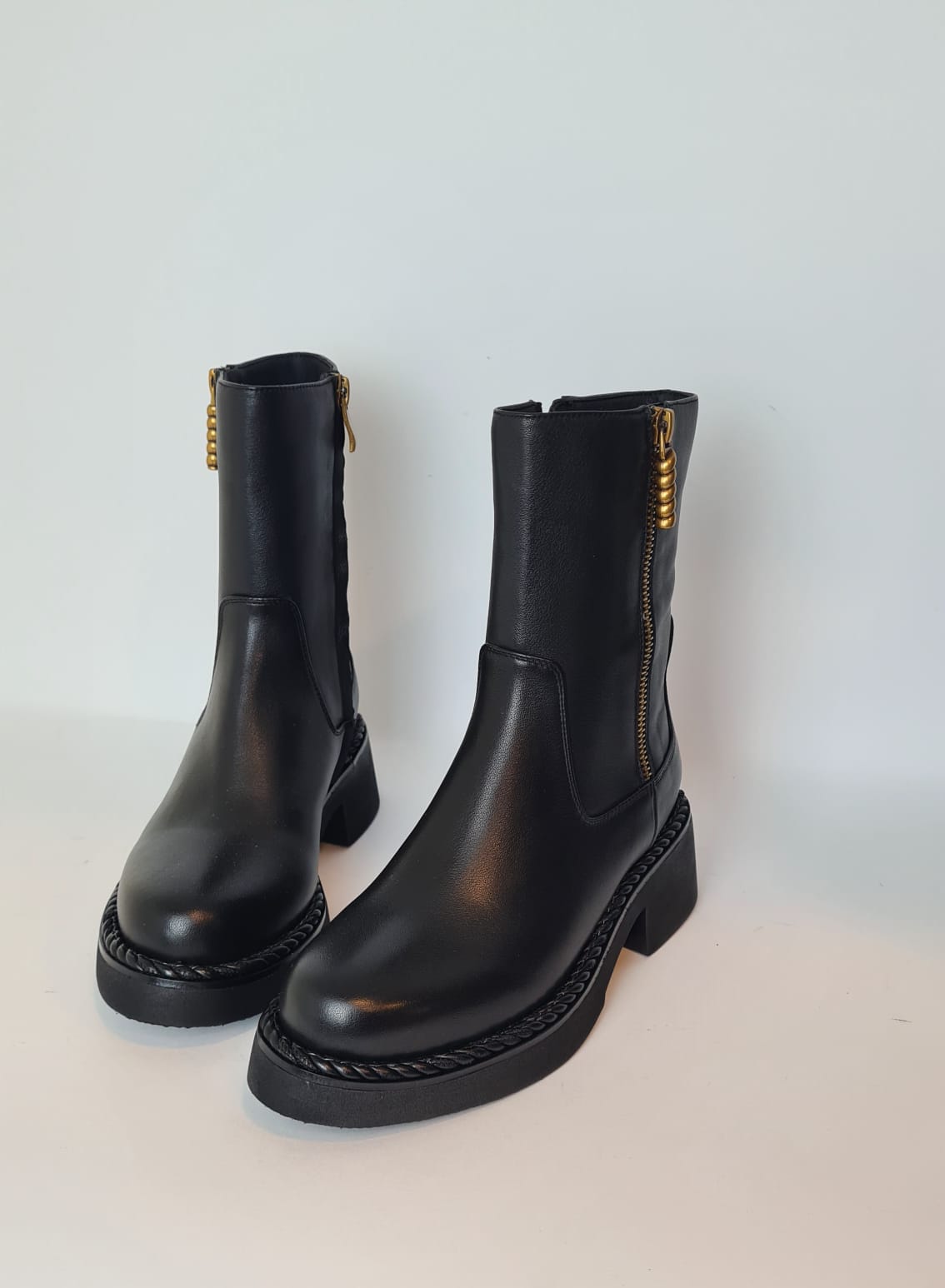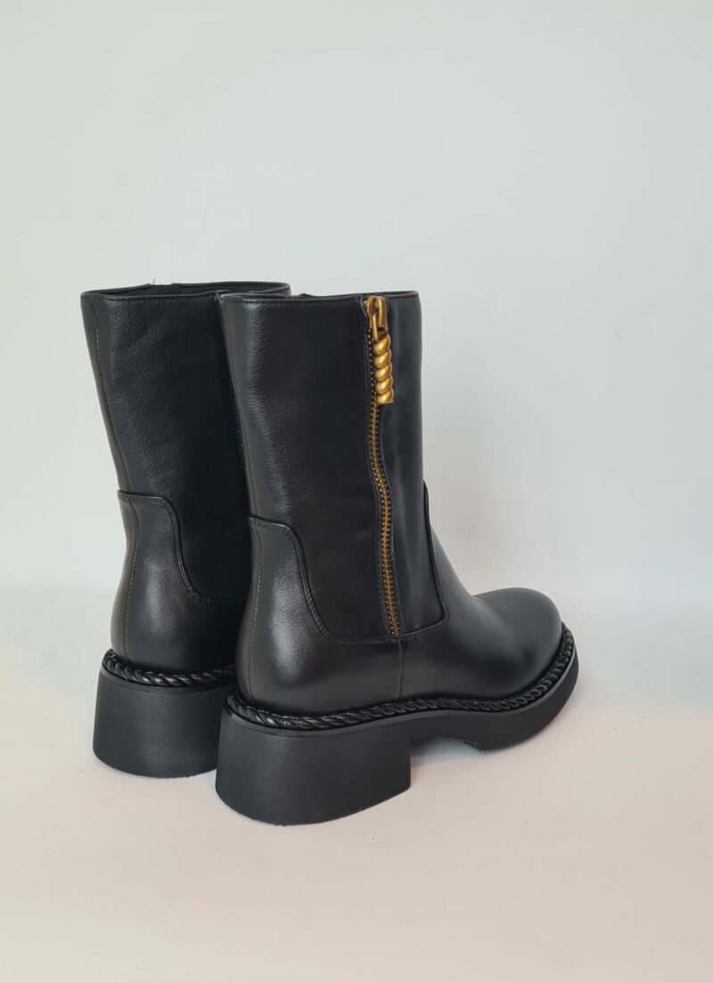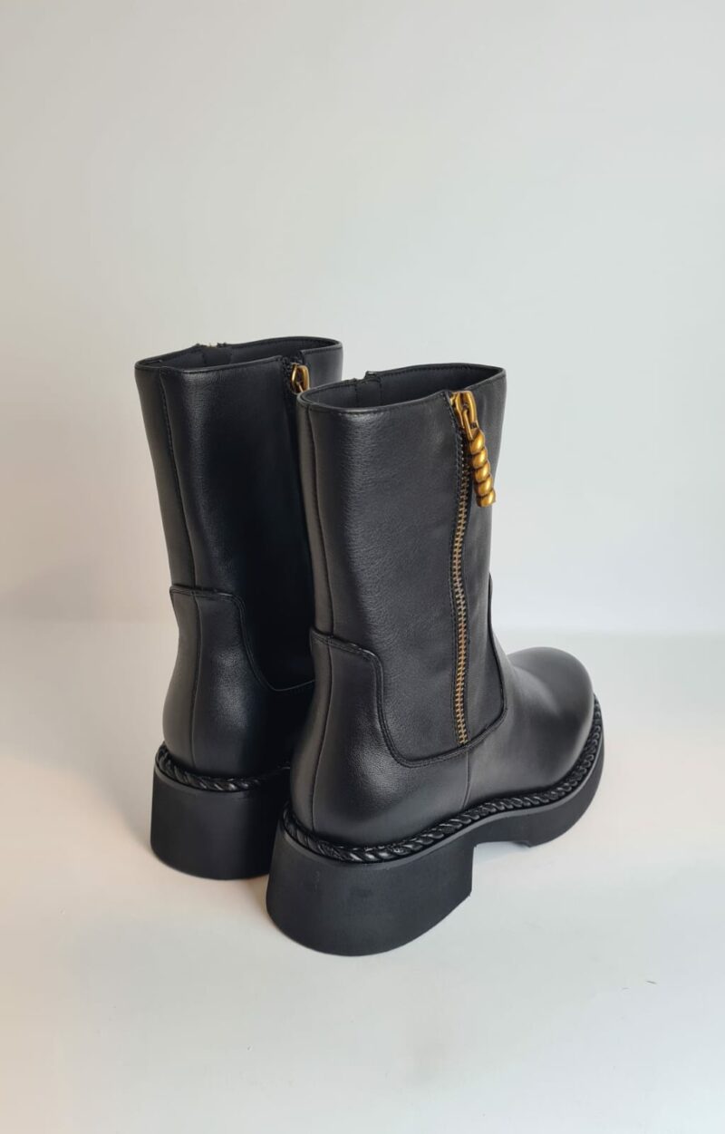 Tronchetto in pelle con un leggero rialzo, punta rotonda e chiusura a zip con accessorio in oro sul lato esterno della scarpa.