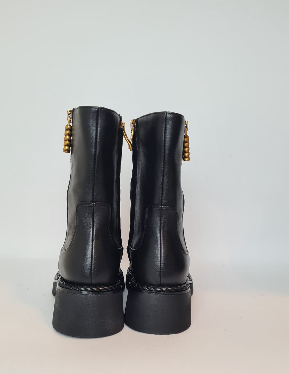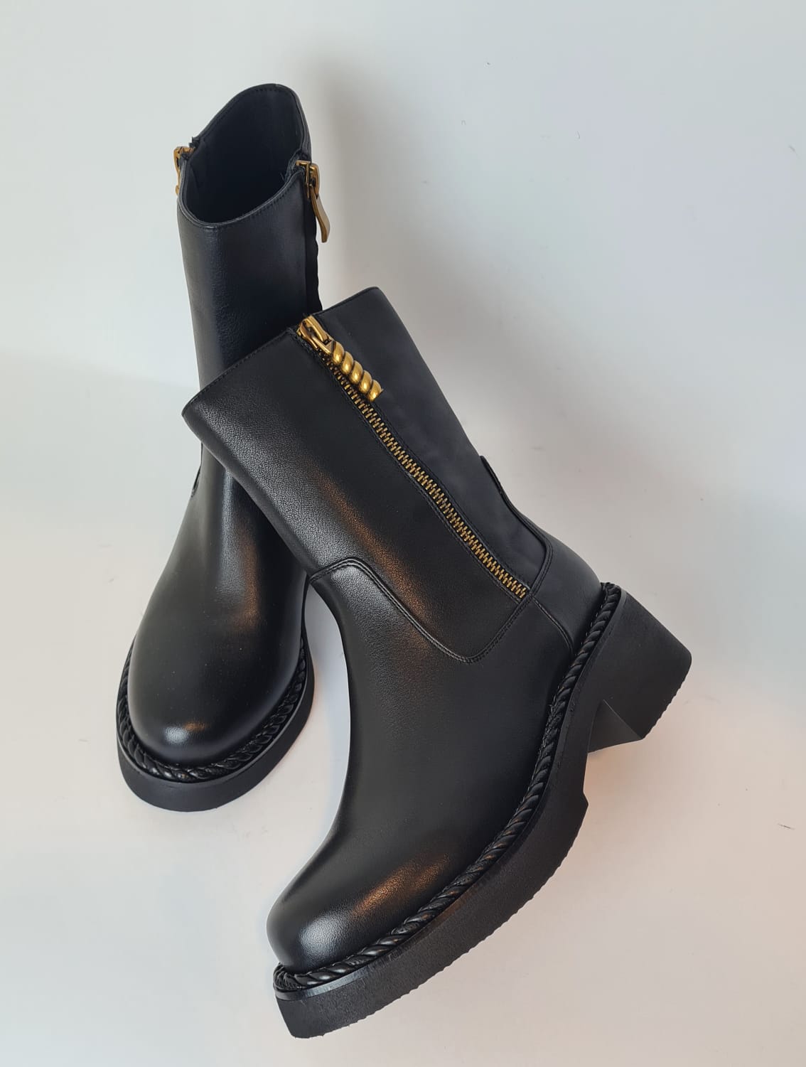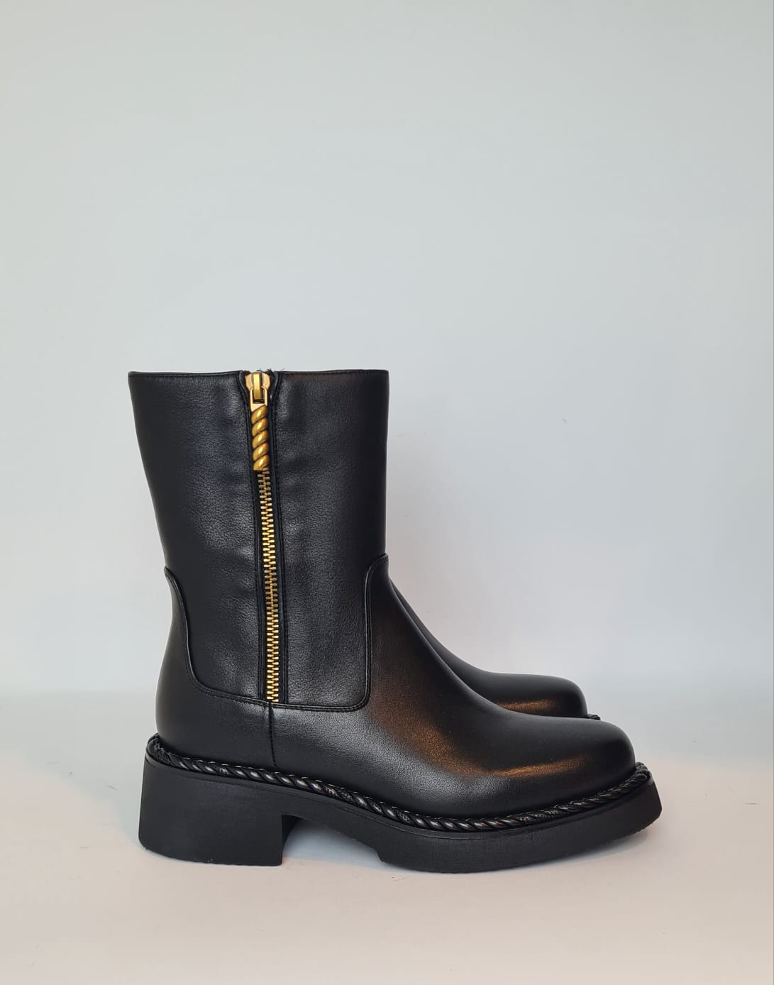 Tronchetto in pelle con un leggero rialzo, punta rotonda e chiusura a zip con accessorio in oro sul lato esterno della scarpa.