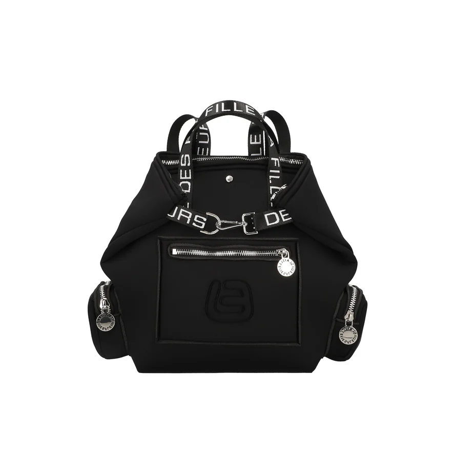 Tasca frontale e laterali con zip. Bretelle regolabili. Finiture argento lucido.