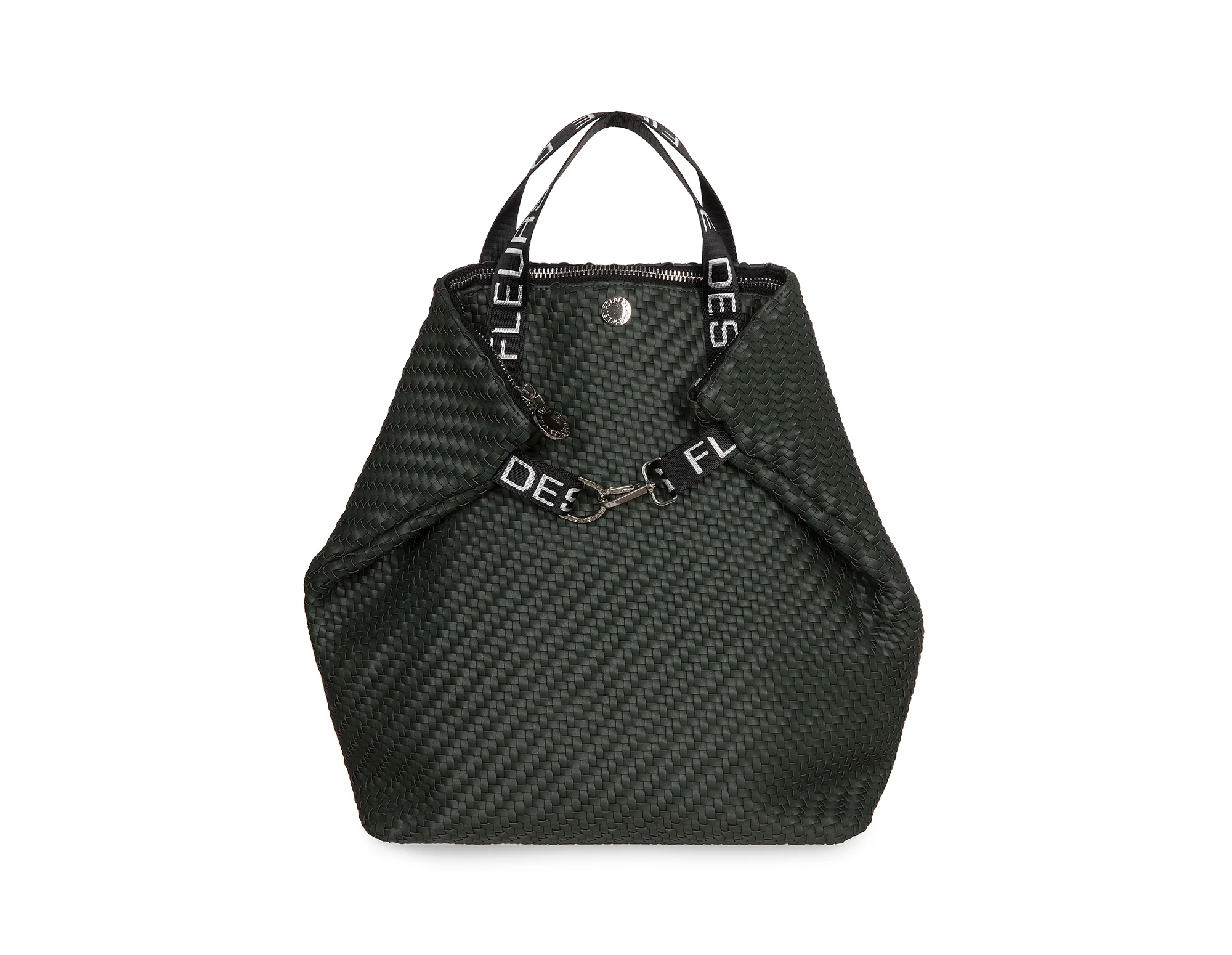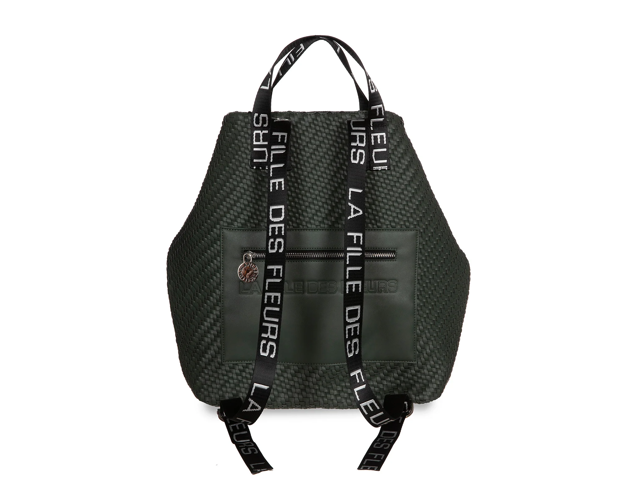 Zaino in ecopelle intrecciata, tasca posteriore con zip. Bretelle regolabili in nastro logato. Finiture argento lucido.