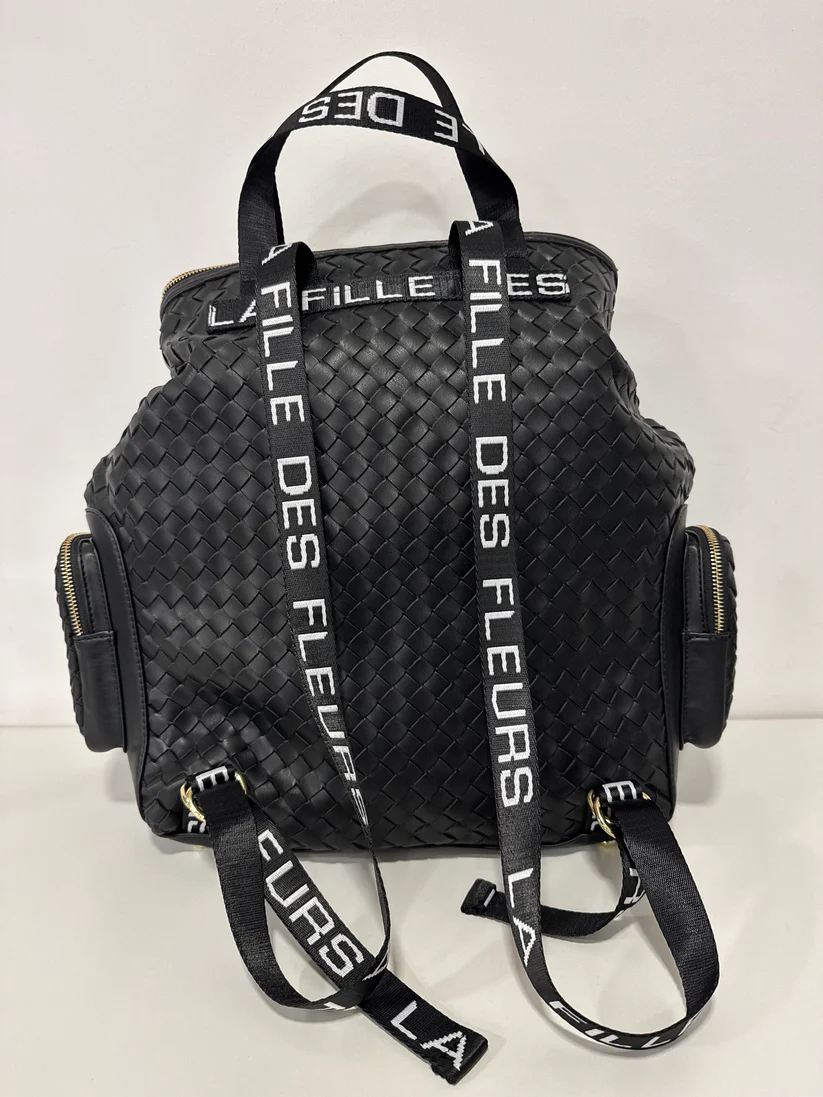 Zaino in ecopelle intrecciato. Tasca anteriore liscia, chiusura con zip e tasche laterali.